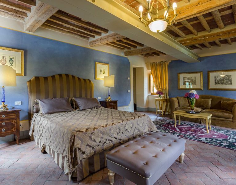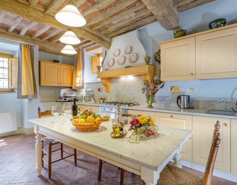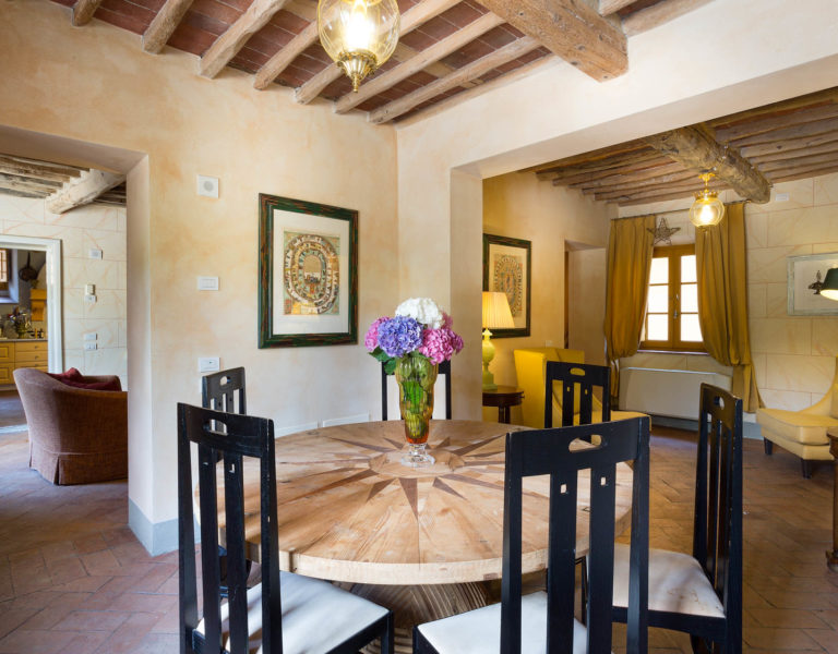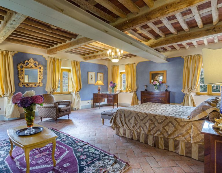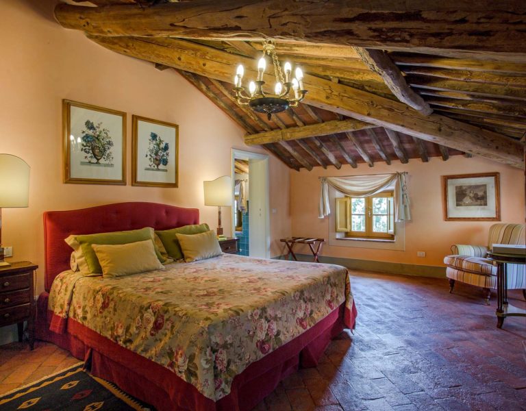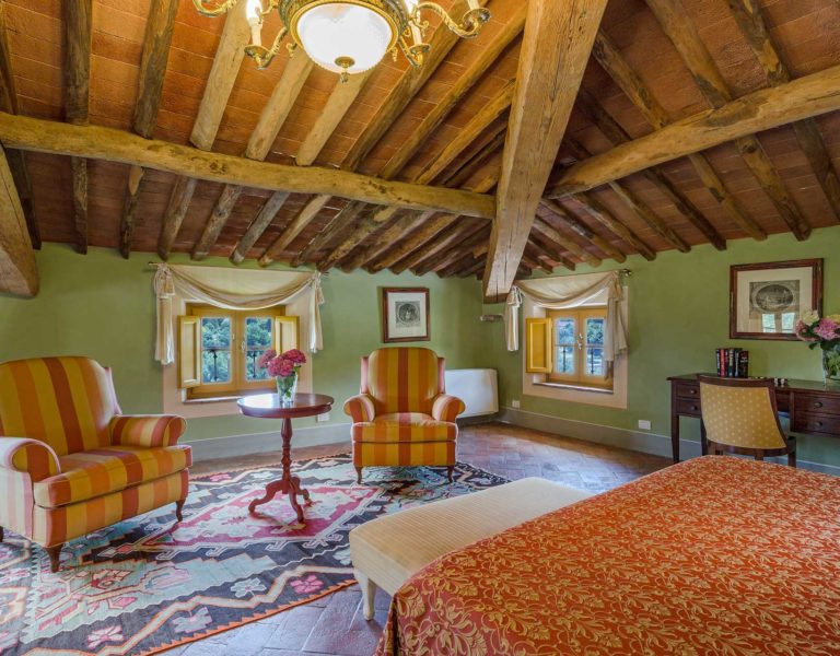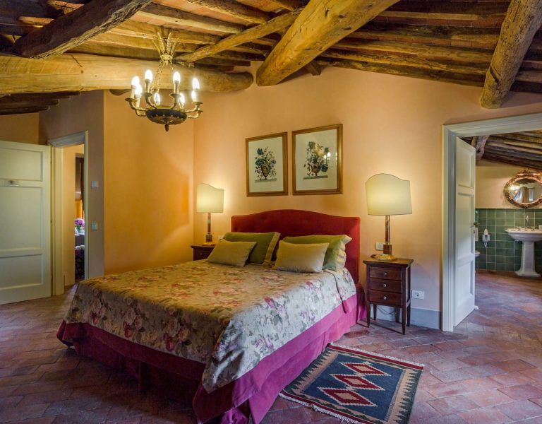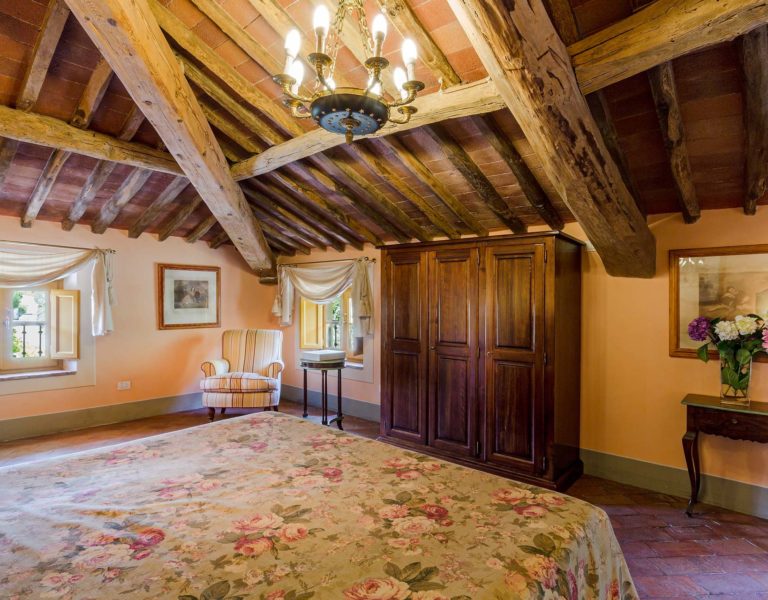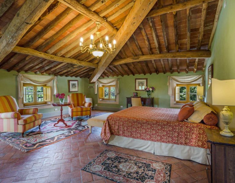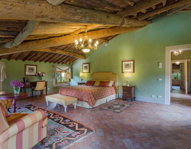 Indoors the farmhouse has kept the typical Tuscan flair: wooden beamed ceilings, terracotta tiled floors and a traditional fully equipped Tuscan kitchen. At the same time the Villa offers all top quality modern comforts: sat.TV, wifi, air conditioning and centralized music system. Every detail has been carefully arranged to make your stay truly unique! On the first and second floors there are 8 splendid bedrooms with en-suite bathrooms, a safe and air conditioning. 6 bedrooms have king size beds, one has a french bed and one two twin size beds, (can be united into one double).