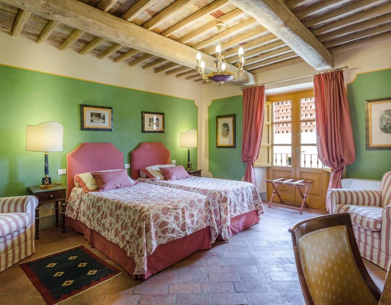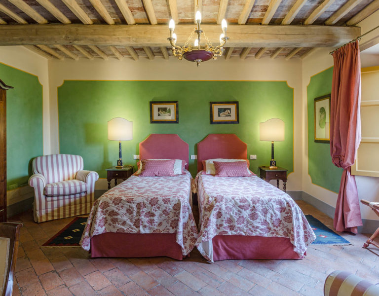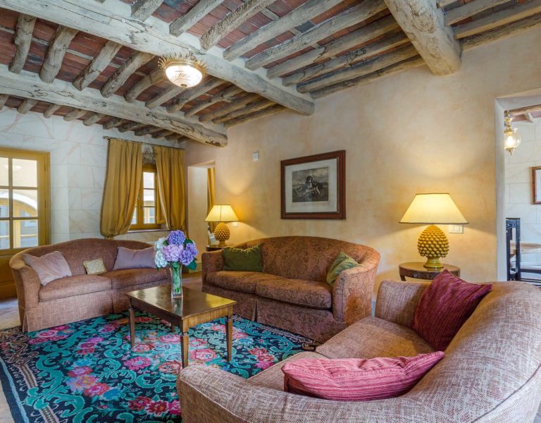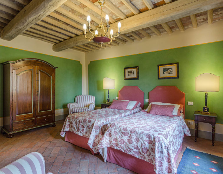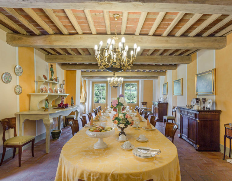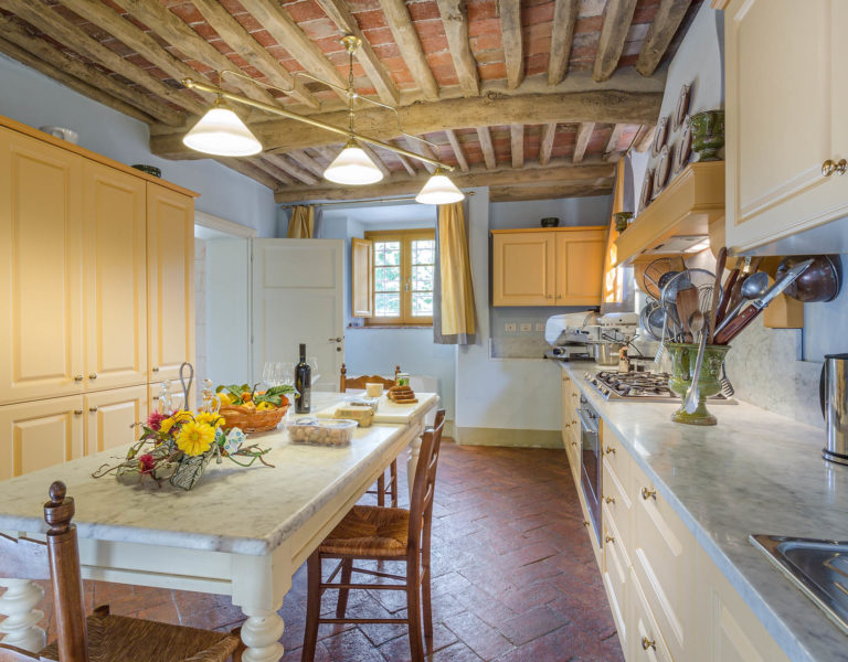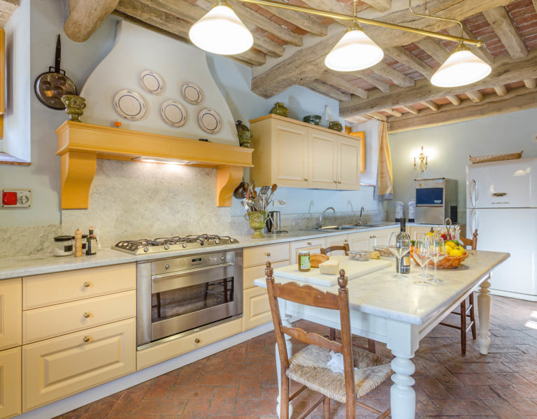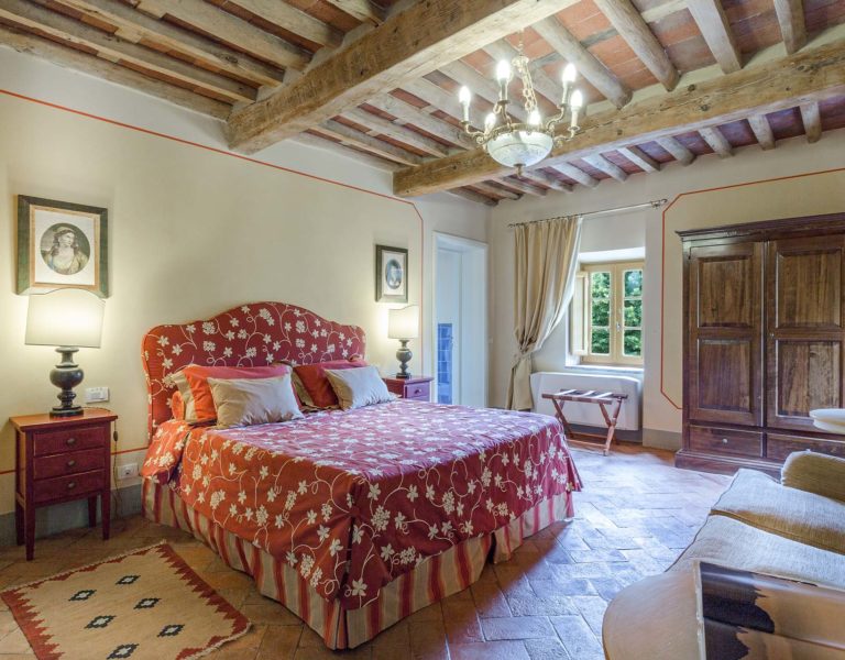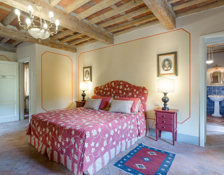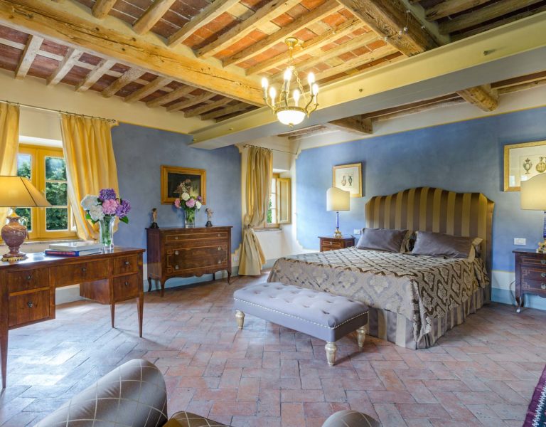Indoors the farmhouse has kept the typical Tuscan flair: wooden beamed ceilings, terracotta tiled floors and a traditional fully equipped Tuscan kitchen. At the same time the Villa offers all top quality modern comforts: sat.TV, wifi, air conditioning and centralized music system. Every detail has been carefully arranged to make your stay truly unique! On the first and second floors there are 8 splendid bedrooms with en-suite bathrooms, a safe and air conditioning. 6 bedrooms have king size beds, one has a french bed and one two twin size beds, (can be united into one double).