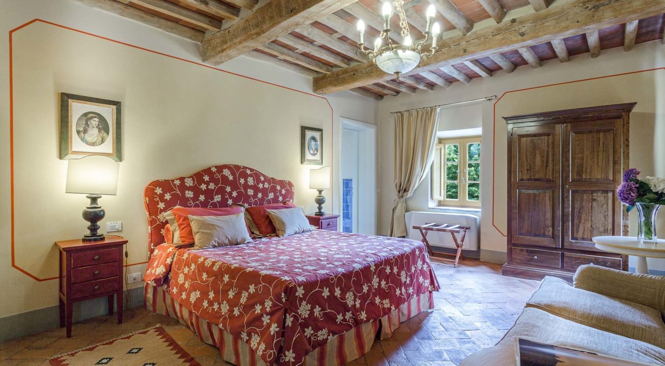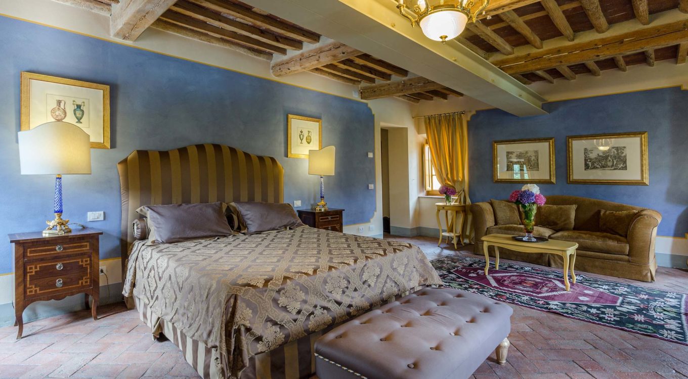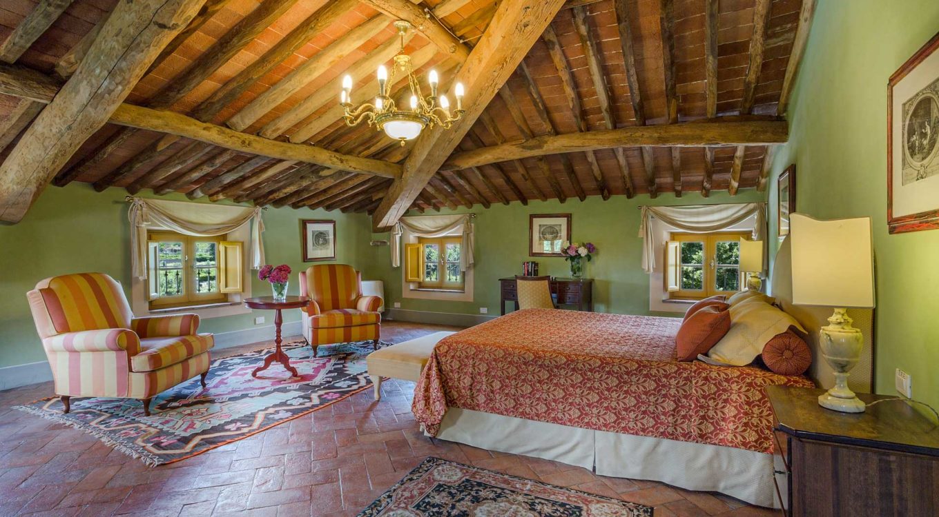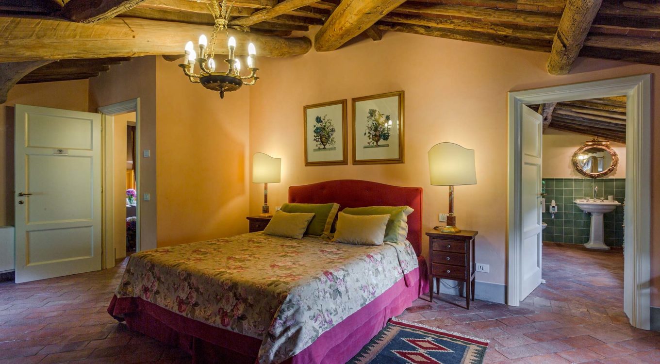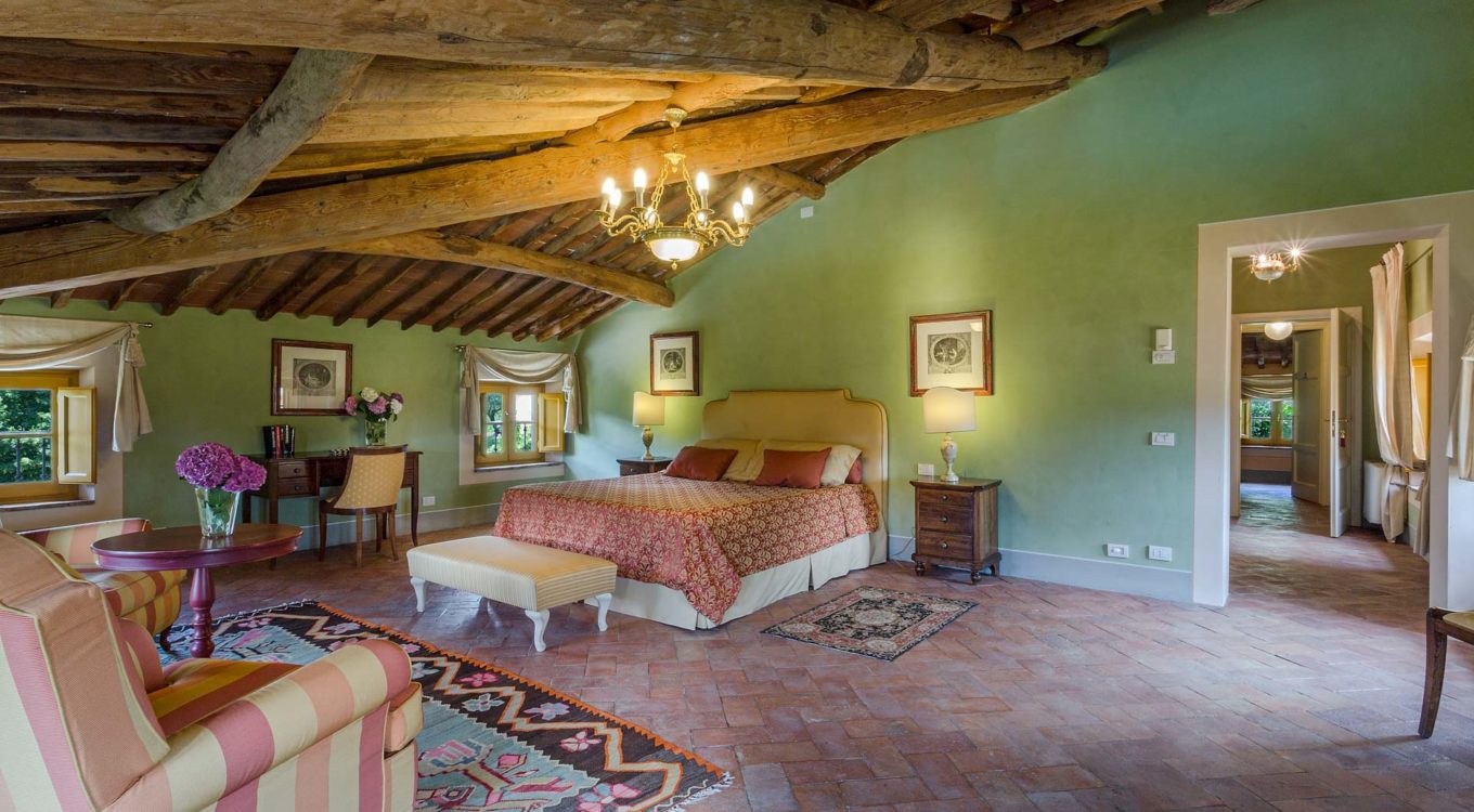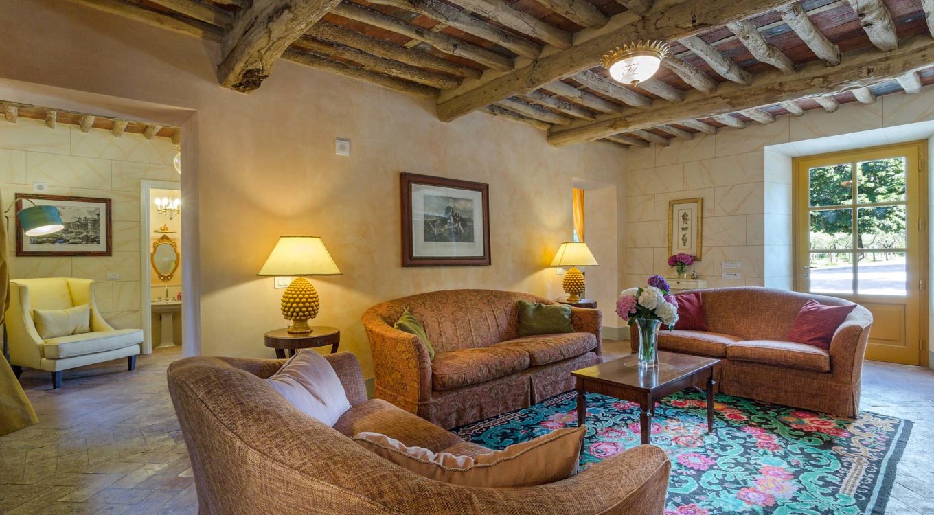 Indoors the farmhouse has kept the typical Tuscan flair: wooden beamed ceilings, terracotta tiled floors and a traditional fully equipped Tuscan kitchen. At the same time the Villa offers all top quality modern comforts: sat.TV, wifi, air conditioning and centralized music system. Every detail has been carefully arranged to make your stay truly unique! On the first and second floors there are 8 splendid bedrooms with en-suite bathrooms, a safe and air conditioning. 6 bedrooms have king size beds, one has a french bed and one two twin size beds, (can be united into one double).