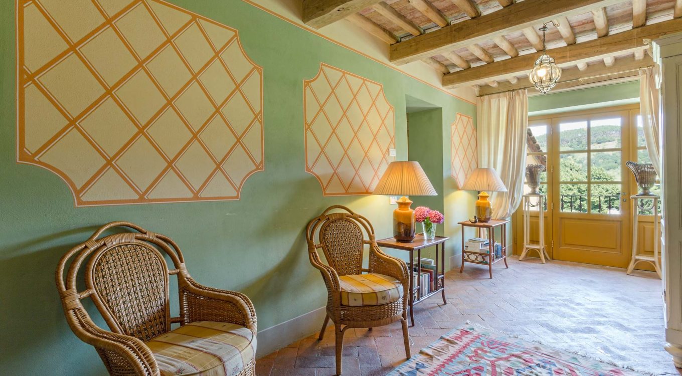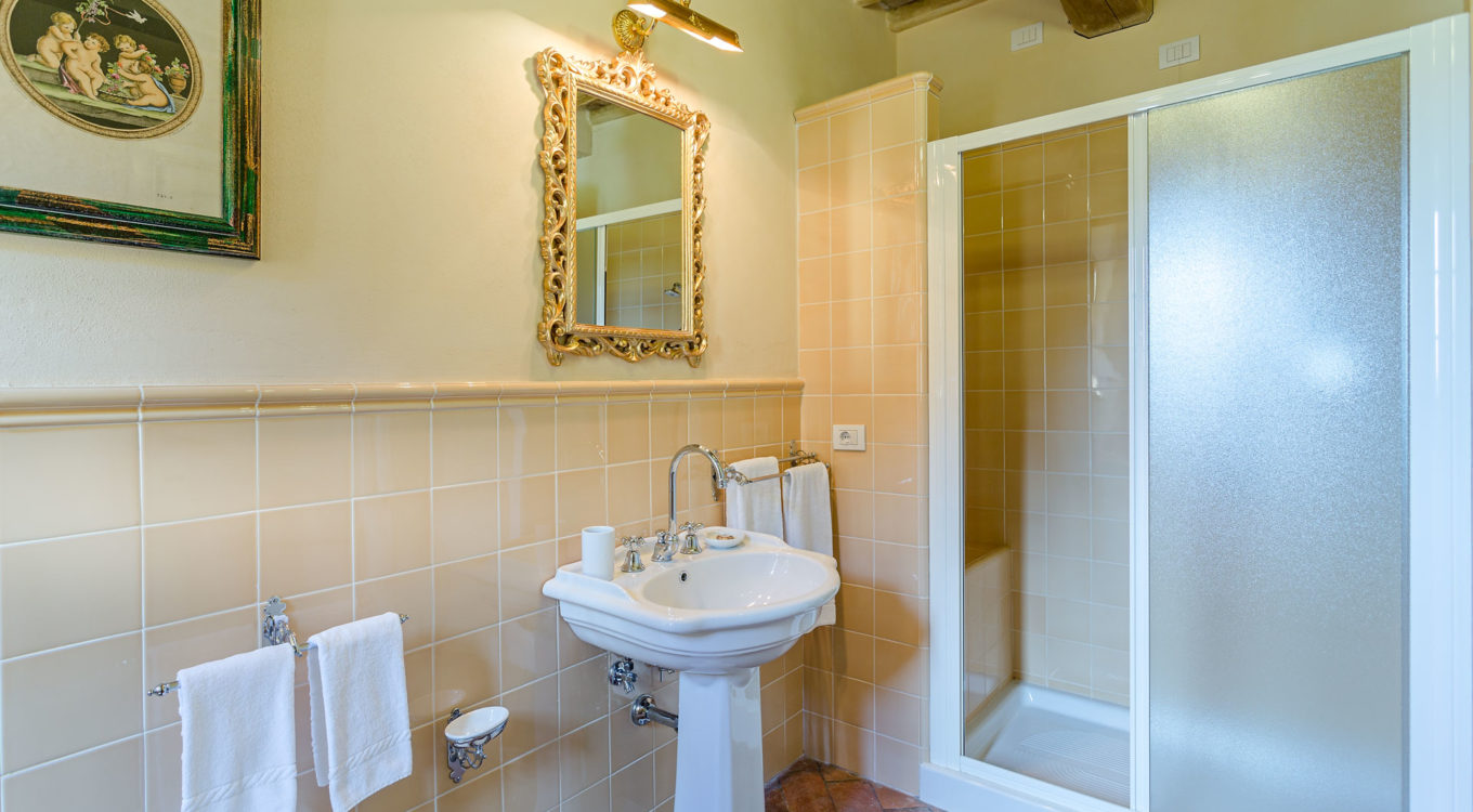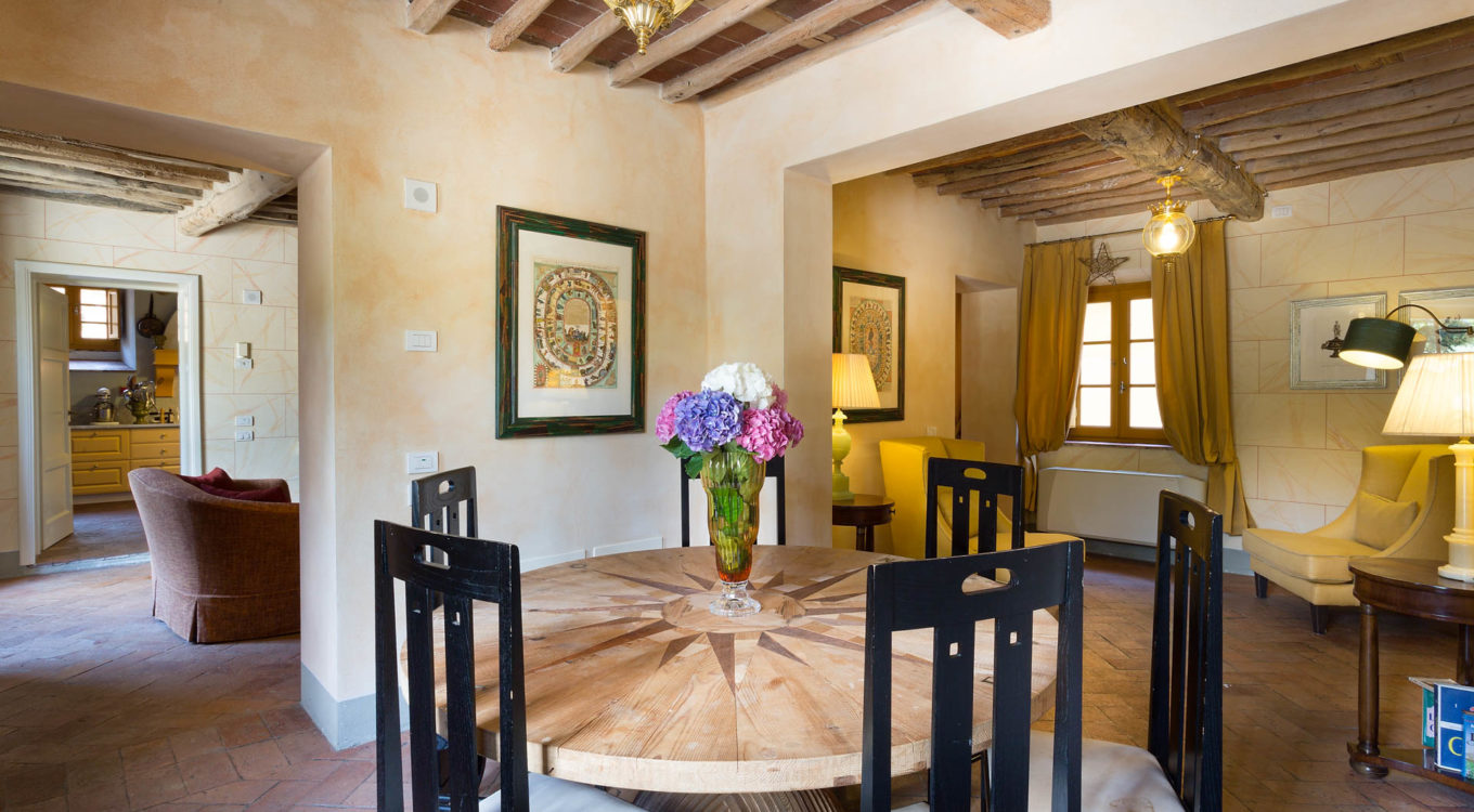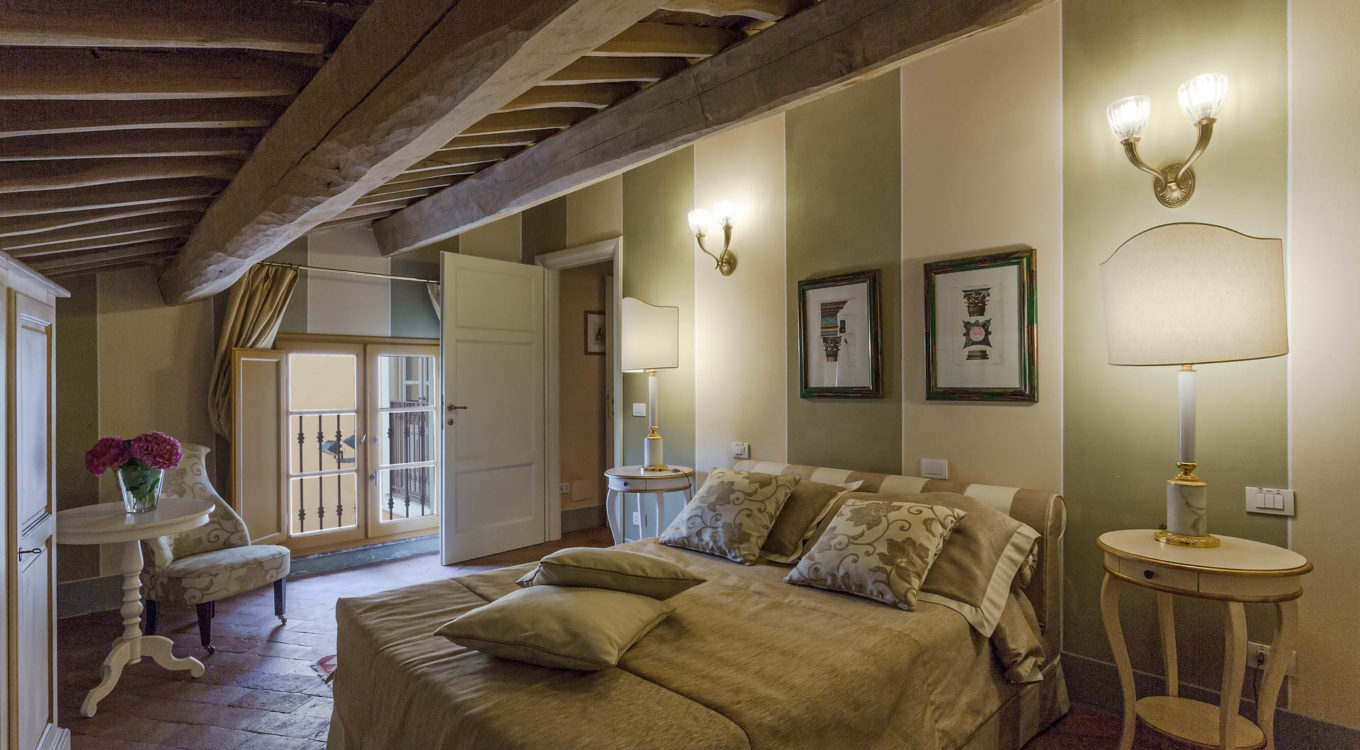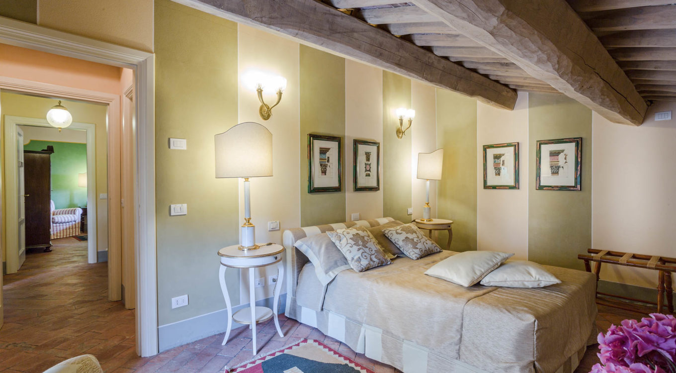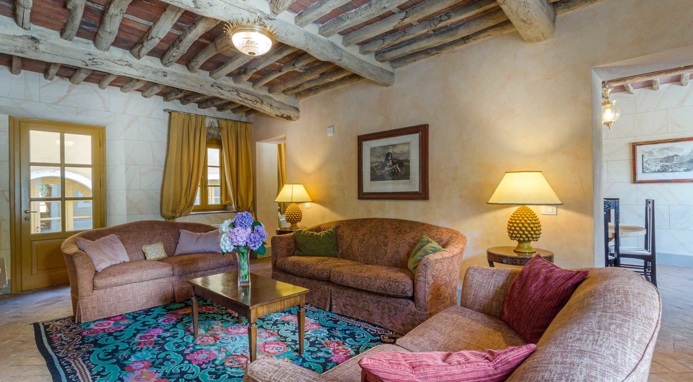 Indoors the farmhouse has kept the typical Tuscan flair: wooden beamed ceilings, terracotta tiled floors and a traditional fully equipped Tuscan kitchen. At the same time the Villa offers all top quality modern comforts: sat.TV, wifi, air conditioning and centralized music system. Every detail has been carefully arranged to make your stay truly unique! On the first and second floors there are 8 splendid bedrooms with en-suite bathrooms, a safe and air conditioning. 6 bedrooms have king size beds, one has a french bed and one two twin size beds, (can be united into one double).