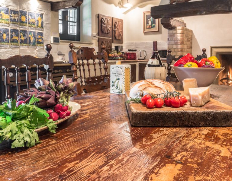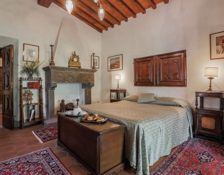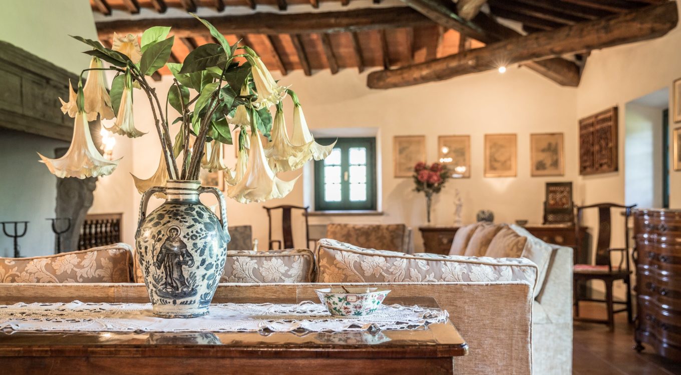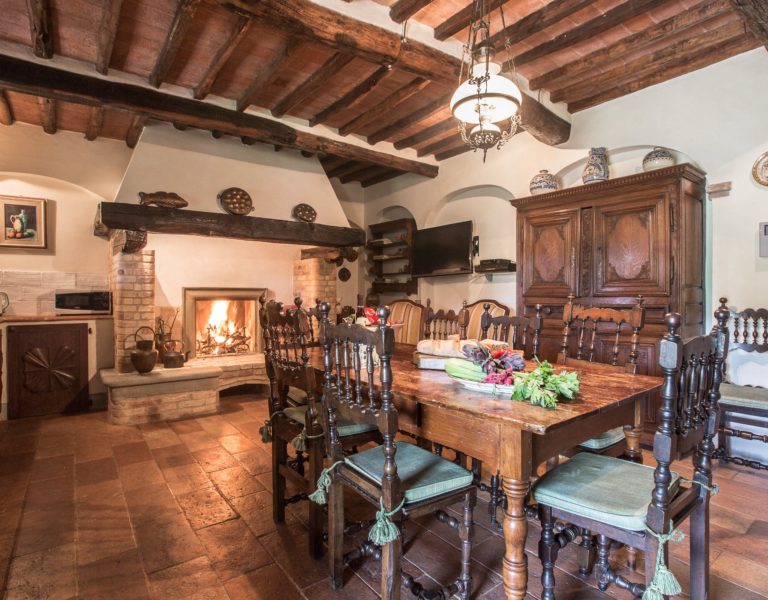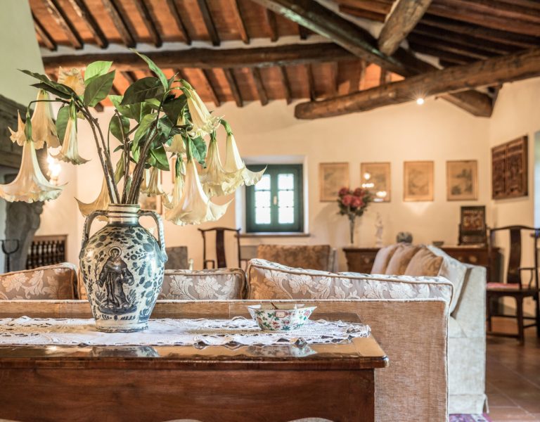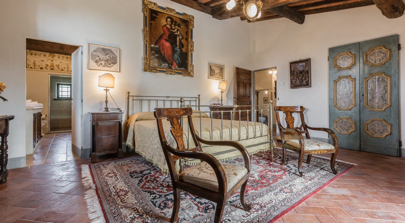 Worth notice is a big 17th cent chestnut plaque over the wide stairs down into the big lounge/dining room. In this spacious room there is a magnificient set of 10 chestnut Florentine chairs of the 17 th cent and a spectacular and remarkable stone fire place from the Northern part of Italy, which dates back to the 16th cent. In the master bedroom a double painted 18th cent. door from a noble palace in Naples and a 17th cent. chest. In the red bedroom a very fine Louis XV wardrobe. There are many antique prints on the walls from different parts of Italy (Venice, Rome, Naples etc). Objects d’art can be seen throughout the villa. All the rooms have Persian carpets. Many other pieces, more or less important, have all been chosen in the spirit of tracing our roots back to the past. Also in the garden one can find stone pieces, as well as old terrracotta Tuscan vases.