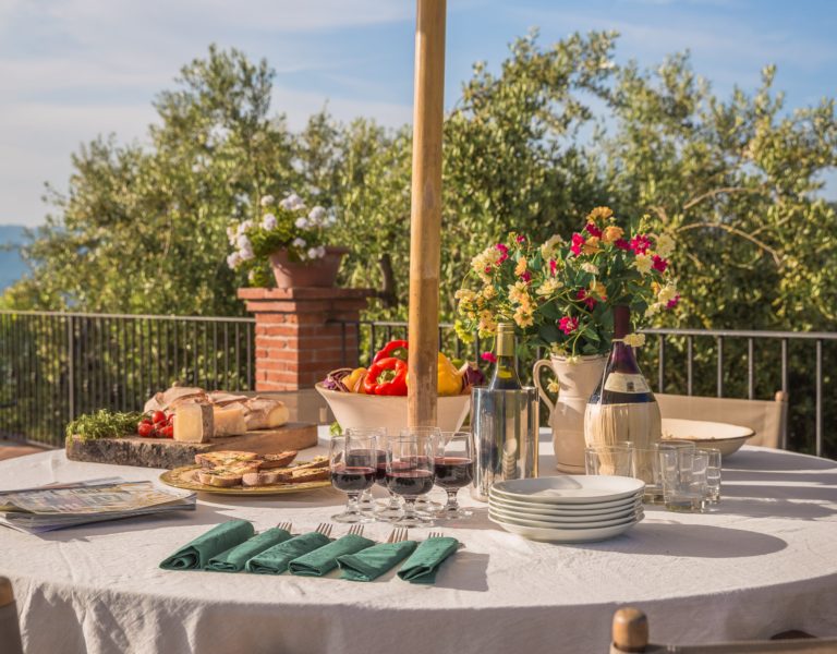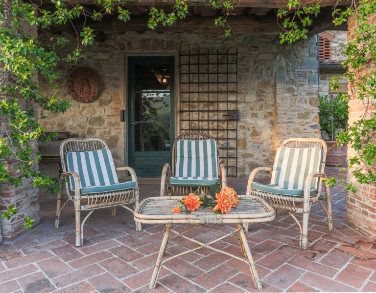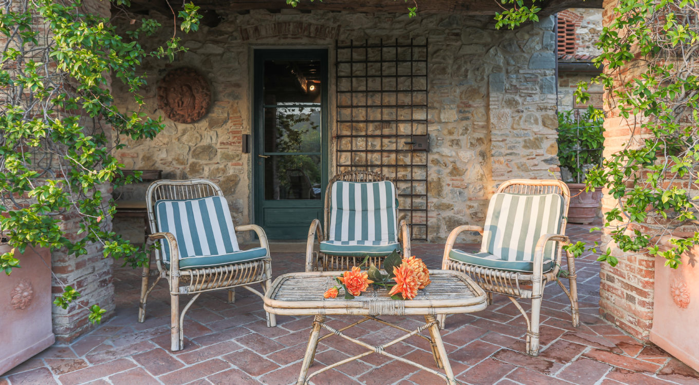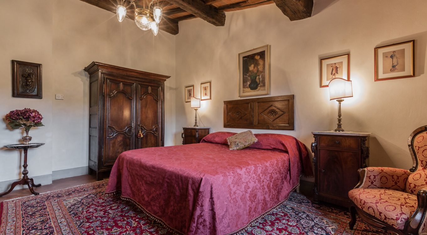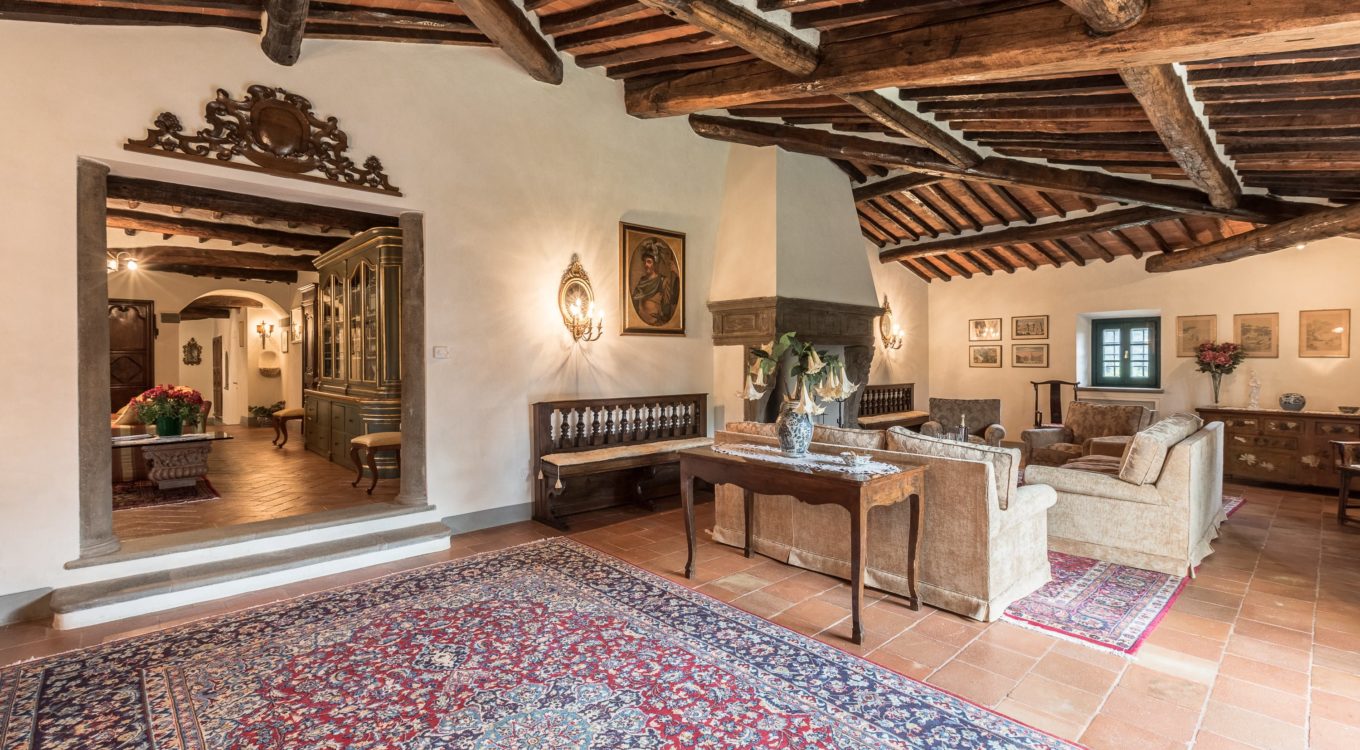 Worth notice is a big 17th cent chestnut plaque over the wide stairs down into the big lounge/dining room. In this spacious room there is a magnificient set of 10 chestnut Florentine chairs of the 17 th cent and a spectacular and remarkable stone fire place from the Northern part of Italy, which dates back to the 16th cent. In the master bedroom a double painted 18th cent. door from a noble palace in Naples and a 17th cent. chest. In the red bedroom a very fine Louis XV wardrobe. There are many antique prints on the walls from different parts of Italy (Venice, Rome, Naples etc). Objects d’art can be seen throughout the villa. All the rooms have Persian carpets. Many other pieces, more or less important, have all been chosen in the spirit of tracing our roots back to the past. Also in the garden one can find stone pieces, as well as old terrracotta Tuscan vases.