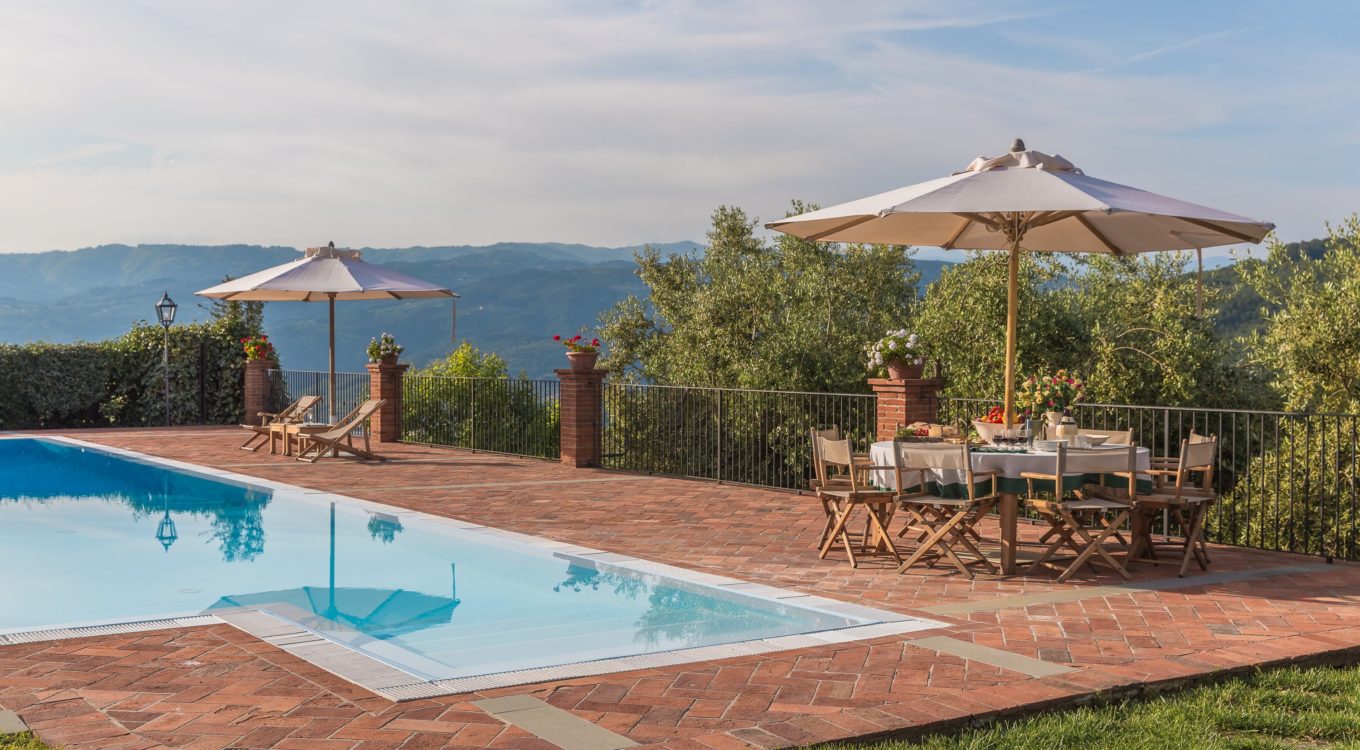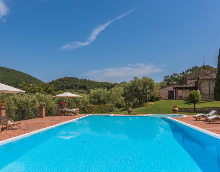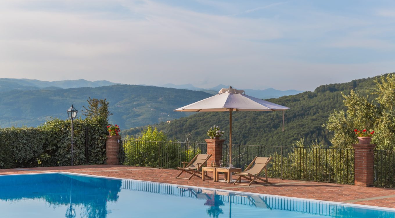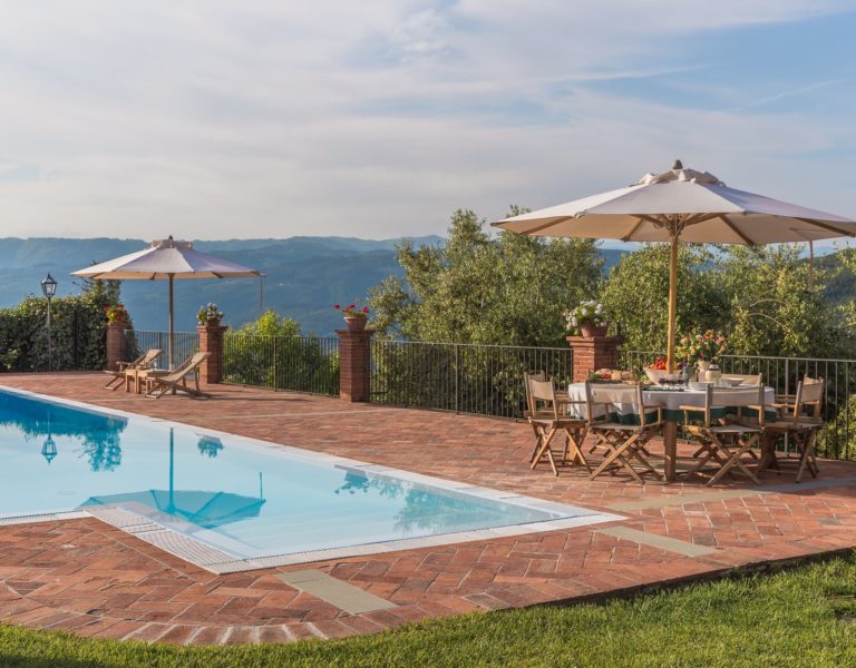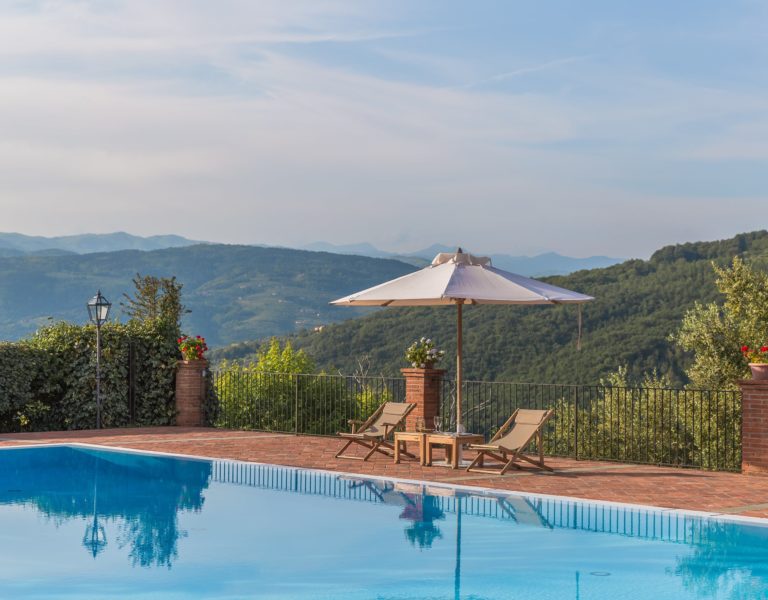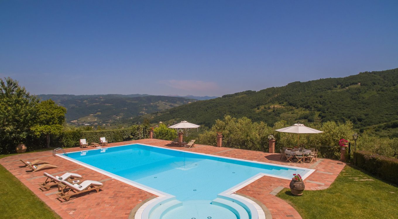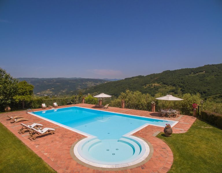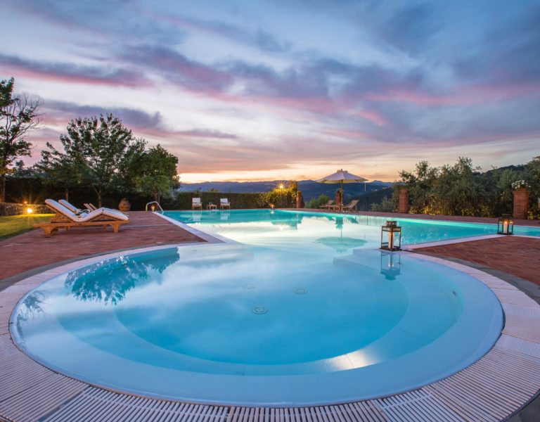 Villa Dell’Angelo is a luxury villa in perfect Tuscan style, typical historical and refined in the smallest detailes. Located in the middle of the Tuscan hills, on the last western slopes of Mount Albano, approximately 250 mt. above sea level. Close to the most important cities as Florence, Lucca, Pisa, easily reachable with every mean of transport. The Swimming Pool (8 mt.×16 mt. and depth from 1.35 to 2,50 mt), is exclusive to the guests of Dell’Angelo. It is an infinity pool with a very large hydromassage area for 8 guests. Under the pool there is a large changing room with 2 showers and WC.