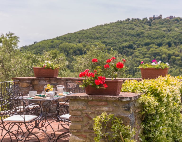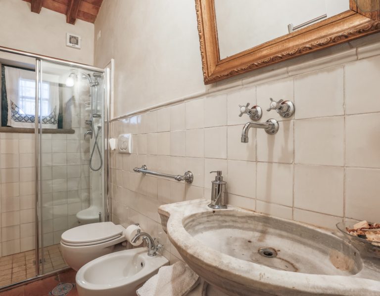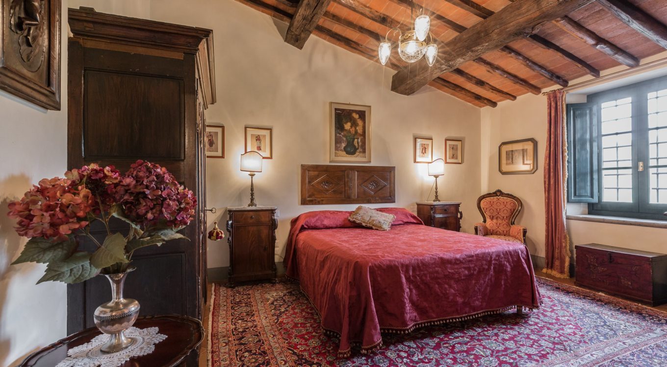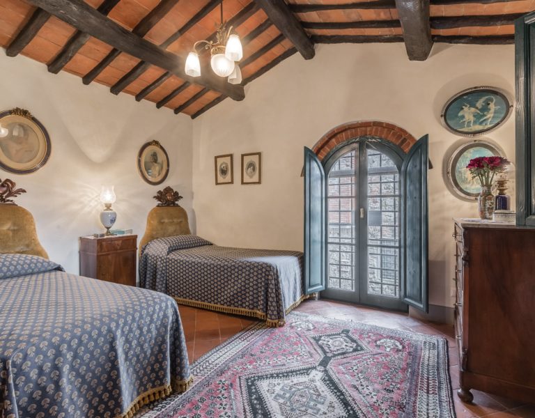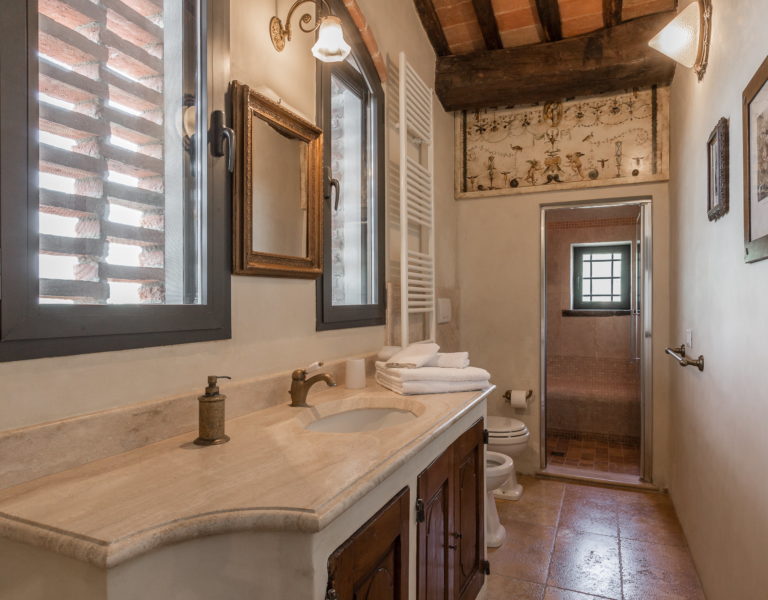 They are furnished with antique furniture, paintings and Persian carpets. From the entrance there is a stone staircase leading to the bedrooms It has a beautiful wrought iron 17thC bannister. On the floor of the middle and top landings of the staricase there are cotto tiles dipicting the Florentine lily. On the ceiling there are cotto rosettes painted in imitation bronze. One main bedroom (30 sq.mtrs.) with its own bathroom with Turkishbath/shower and a lovely view up to Monsummano Alto which is lit up at night. Another bedroom which is a little smaller and has a view over the valley, olive groves, woods and pool. It shares a bathroom (with a Jacuzzi bath and shower with light and aroma therapy) with the third bedroom which has two single beds which, on rerquest, can be put together to form a double bed. This also has a pidgeon hole window which looks up to Monsummano Alto (Alto means “on high”). All the upstairs bedrooms have antique cotto floors and beams, which have been restored with taste and care by the owners.