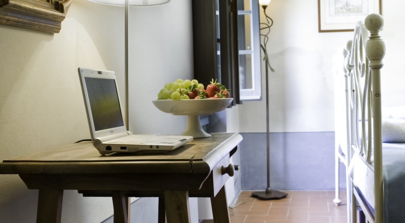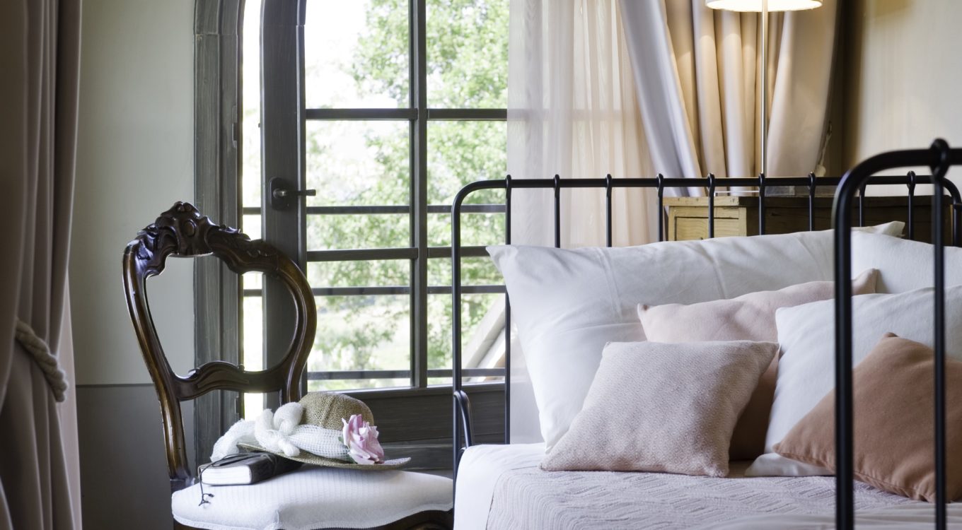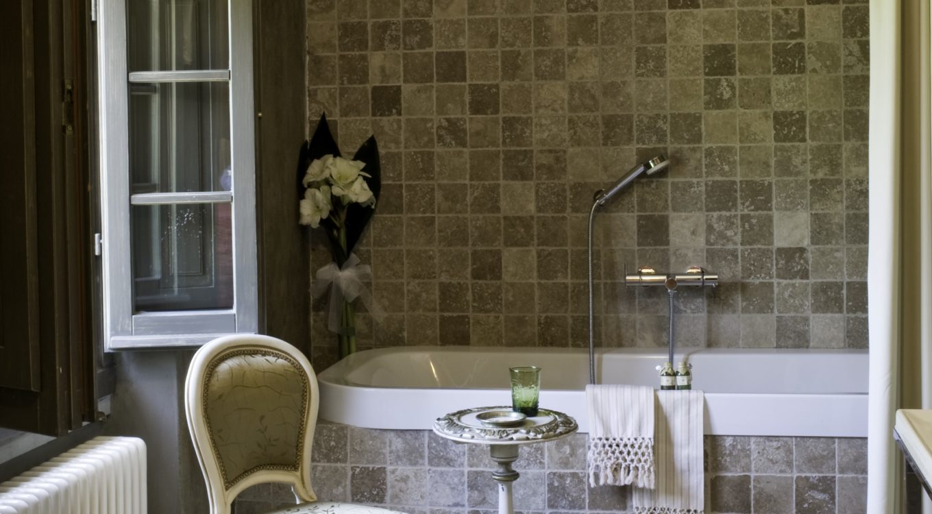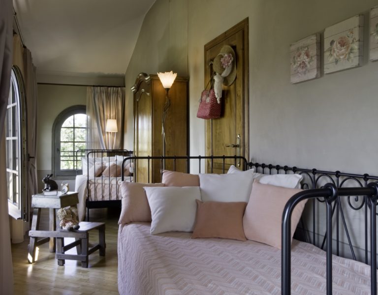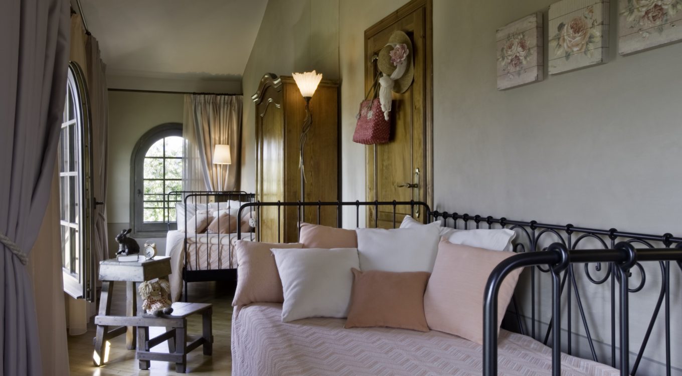 There is a further pretty twin bedroom located in the second floor tower room, once a medieval look out tower. It has windows on three sides and provides a 360 degree view. It shares a bathroom on the first floor landing. This bedroom also has air conditioning.