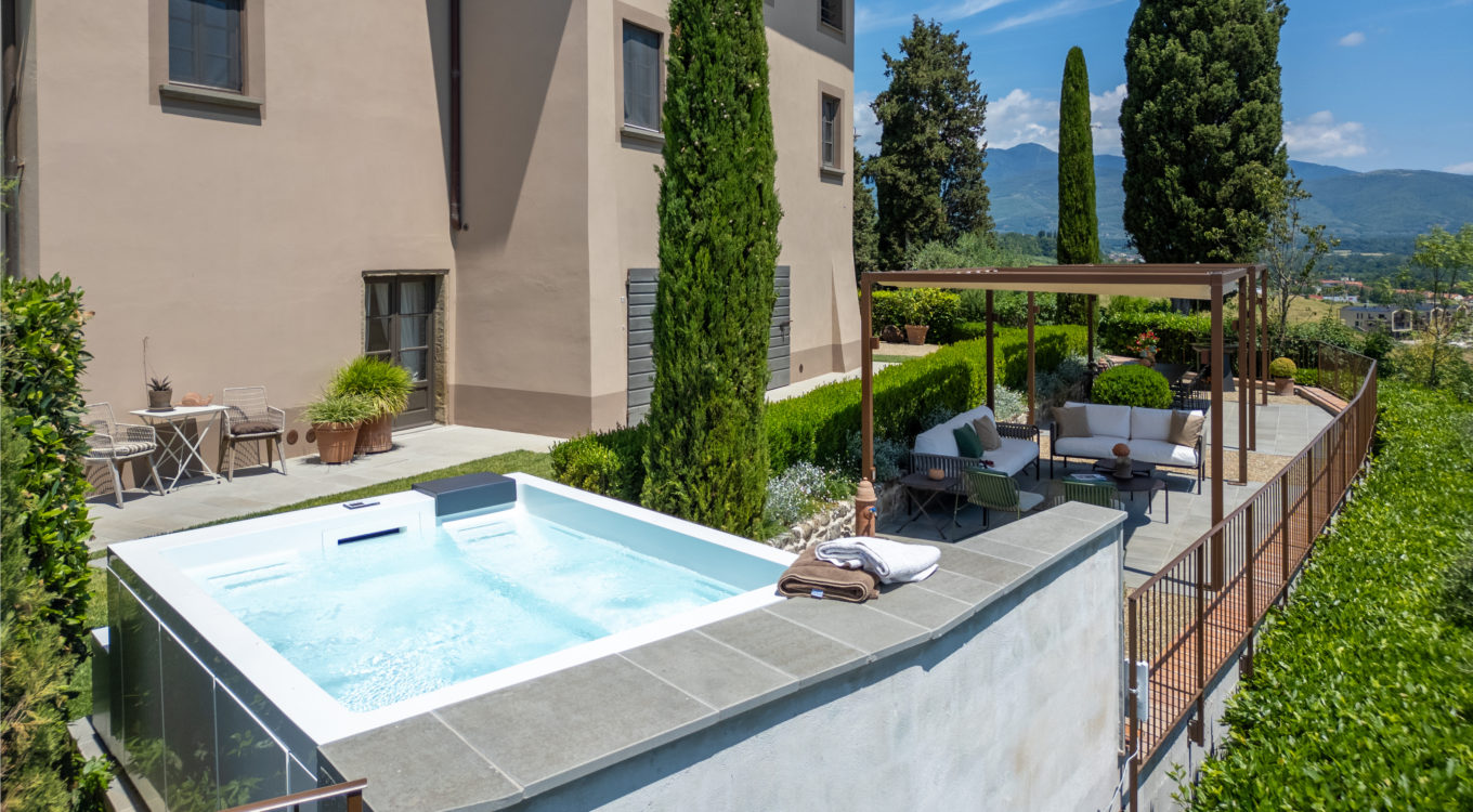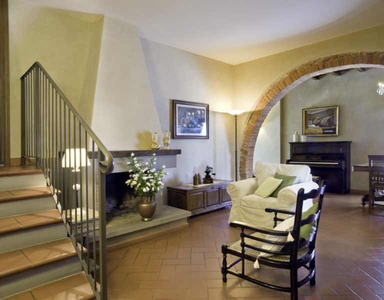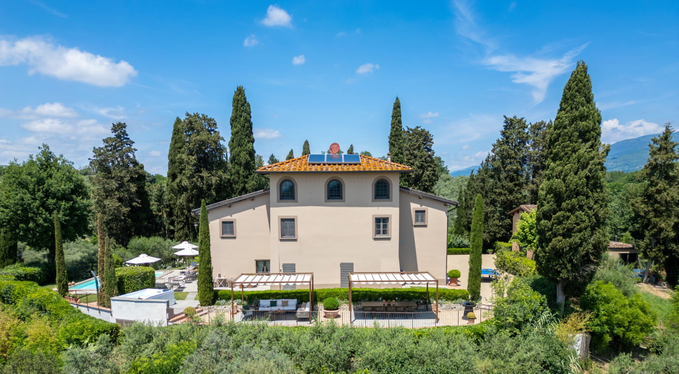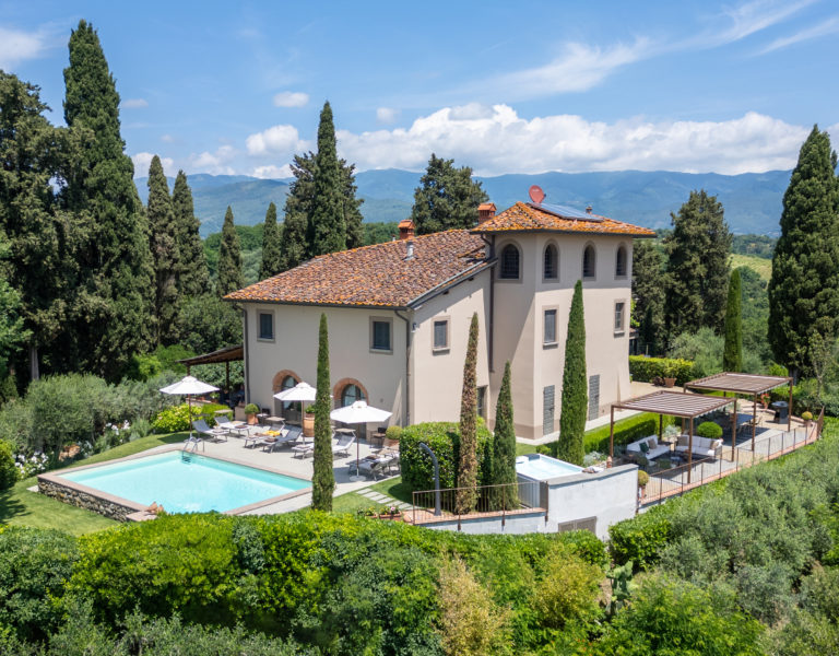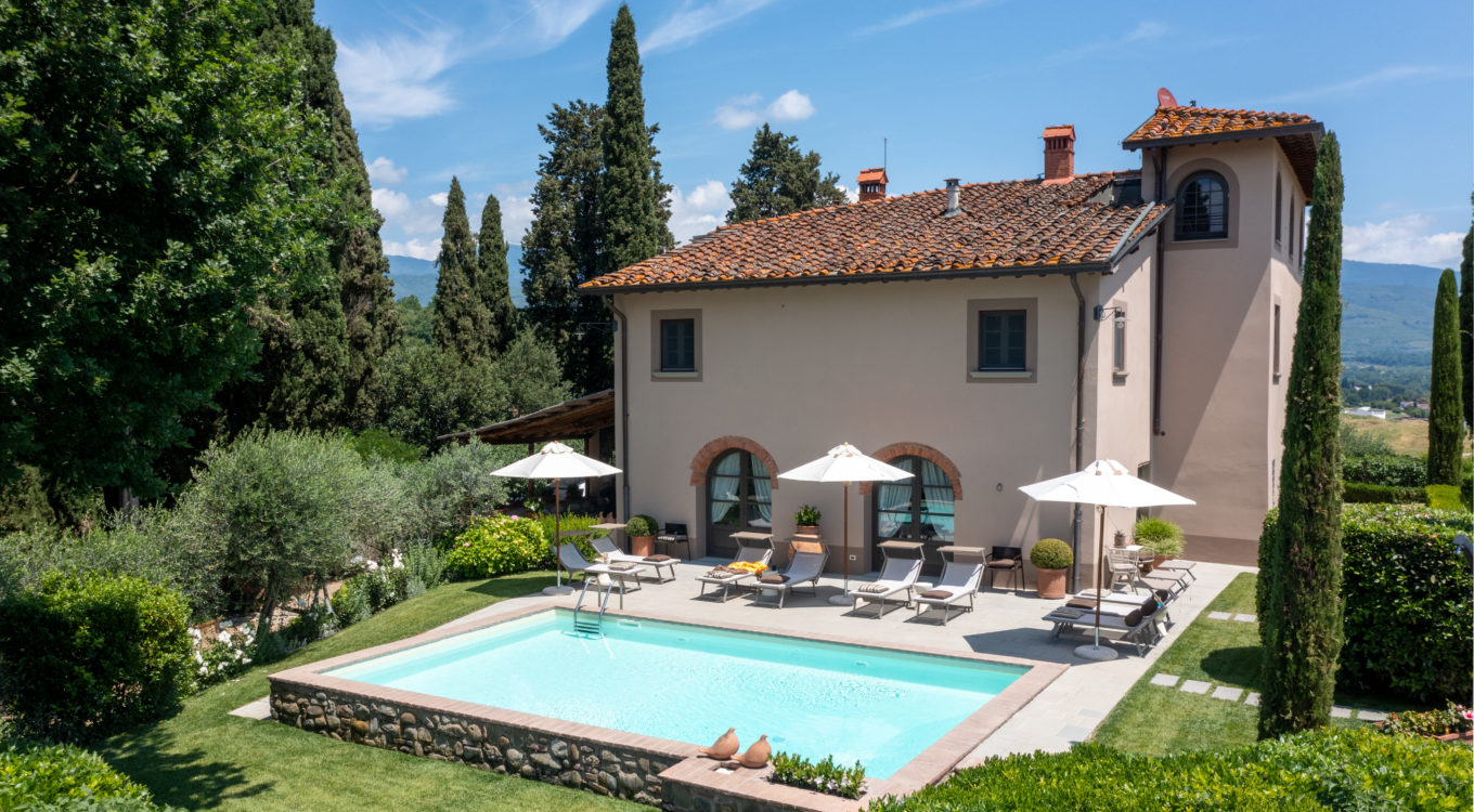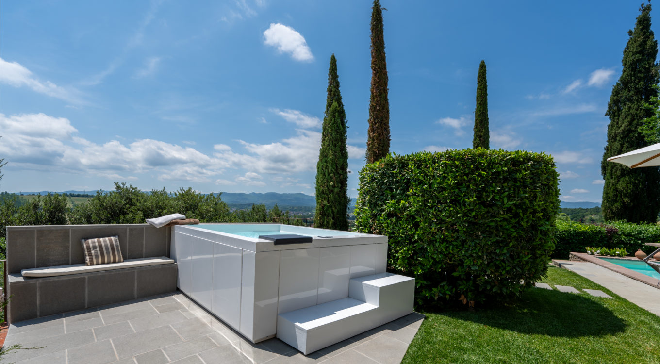 Villa IL COLTO is a beautiful villa on three floors, counts 6 bedrooms, 3 doubles and 3 twins (one of twins can be made double), and 5 bathrooms, located in the countryside just outside of a small town. Due to its location on the top of a small hill, it is thought that the villa was once a look out tower for a nearby castle. It was later transformed into a family villa and was once owned bythe renowned Medici family from Florence. It is a perfect base, for exploring Florence (35 mins) and Chianti. It is also within easy reach of and Arezzo (30 mins) and Siena (1 hour). The villa is set in a garden with its own heated private pool, hot tub spa and panoramic terracev with views to the surrounding countrysideand towards the local town, which has avariety of local shops as well as a supermarket, restaurants and bars (1km).