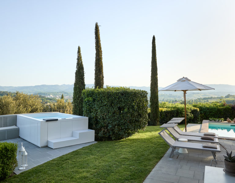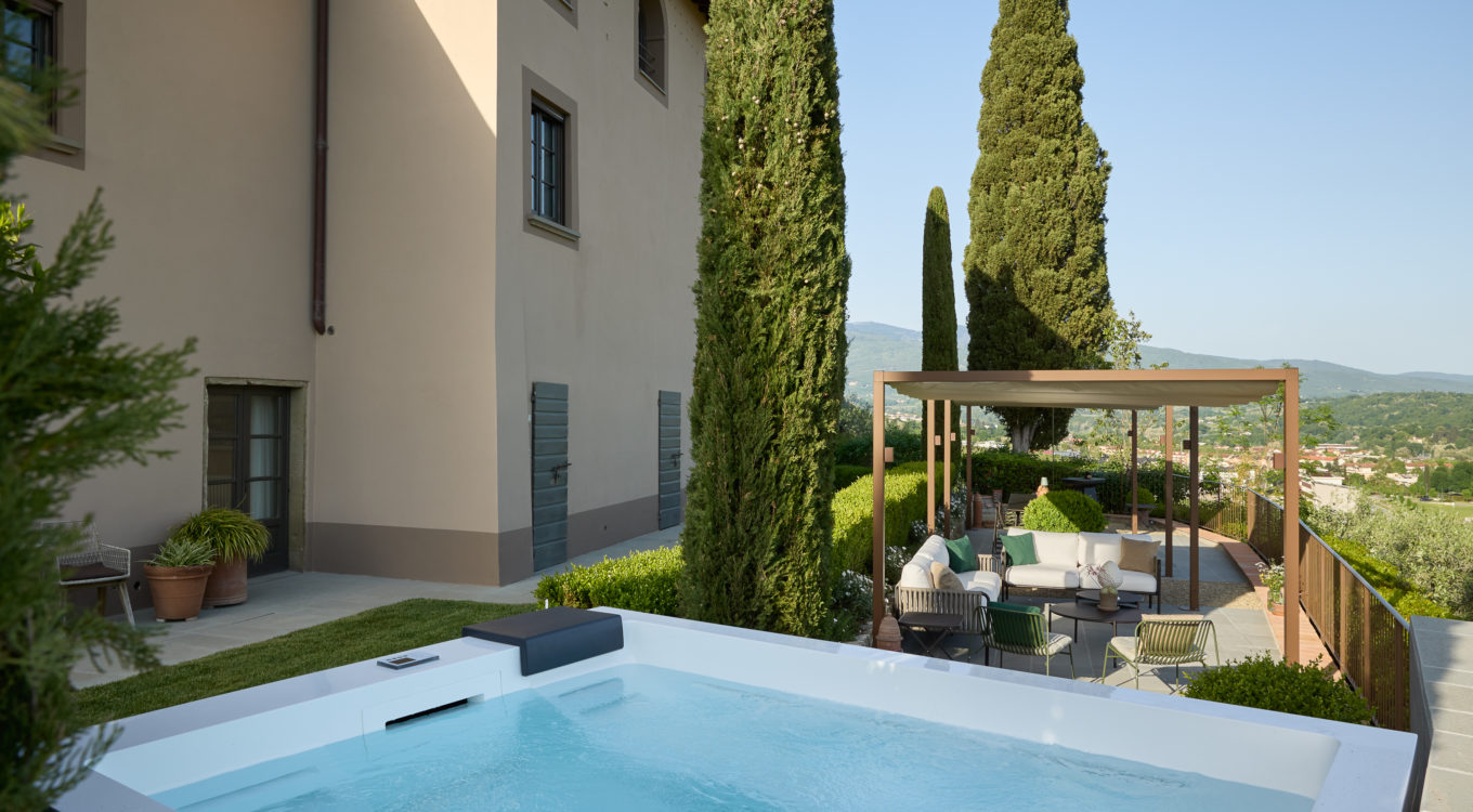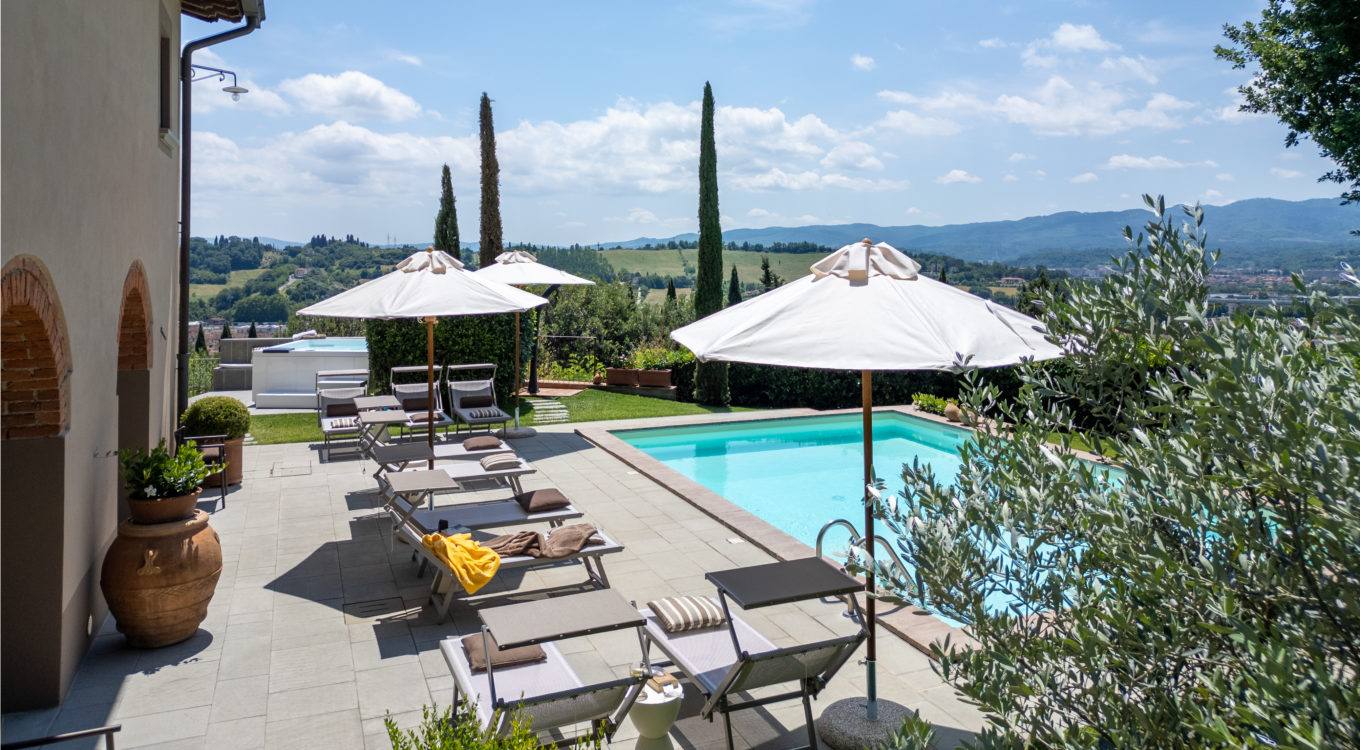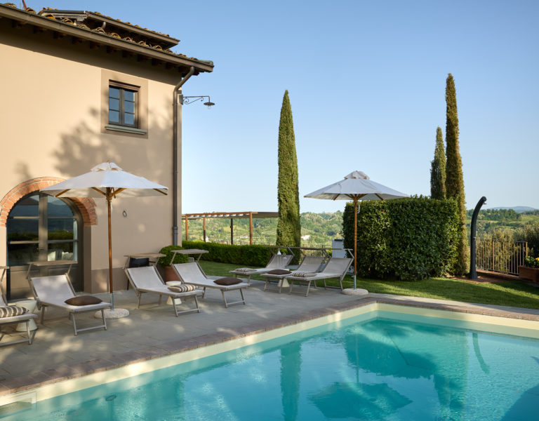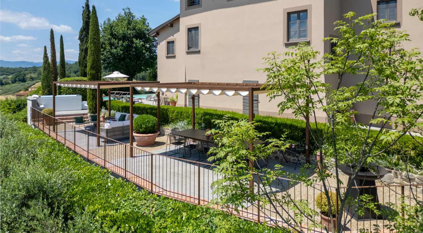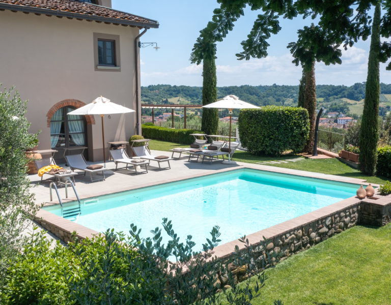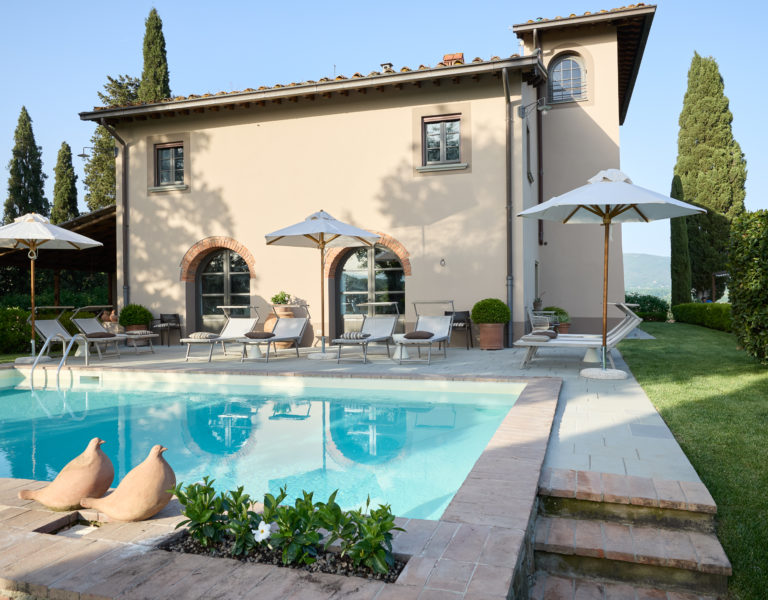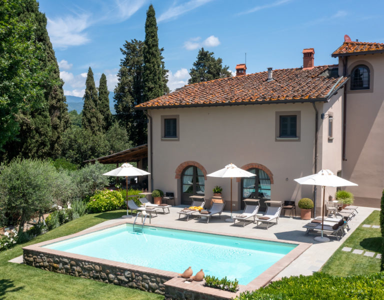 Villa IL COLTO is a beautiful villa on three floors, counts 6 bedrooms, 3 doubles and 3 twins (one of twins can be made double), and 5 bathrooms, located in the countryside just outside of a small town. Due to its location on the top of a small hill, it is thought that the villa was once a look out tower for a nearby castle. It was later transformed into a family villa and was once owned bythe renowned Medici family from Florence. It is a perfect base, for exploring Florence (35 mins) and Chianti. It is also within easy reach of and Arezzo (30 mins) and Siena (1 hour). The villa is set in a garden with its own heated private pool, hot tub spa and panoramic terracev with views to the surrounding countrysideand towards the local town, which has avariety of local shops as well as a supermarket, restaurants and bars (1km).