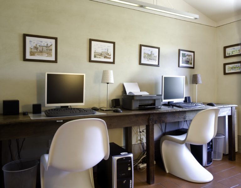 A staircase leads from the downstairs entrance hall to the first floor where there is a second lounge area with open fireplace and satellite TV. There are 5 bedrooms on the first floor and a further bedroom in the tower. On the first floor there are two twin rooms (can be made doubles). These two twin bedrooms share a bathroom with shower. There are three double bedrooms, one with an en suite bathroom with bathtub, one has an en suite bathroom with shower and the third has a bathroom just across the hallway with a double sink, shower and bathtub (shared with the tower bedroom). Only one twin room can be made double. All bathrooms have hairdryers. Also on the first floor is a well-equipped study with one computers linked to a fast ADSL internet. connection with printer. All bedrooms on the first floor have air conditioning and all bedrooms also have screens on the windows.