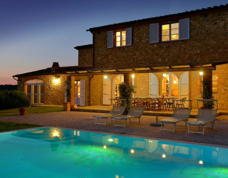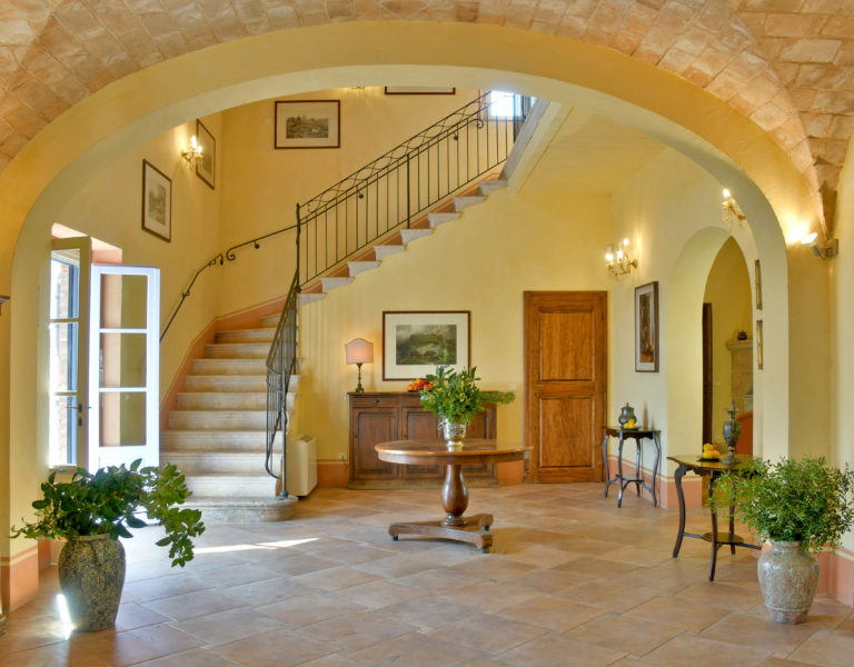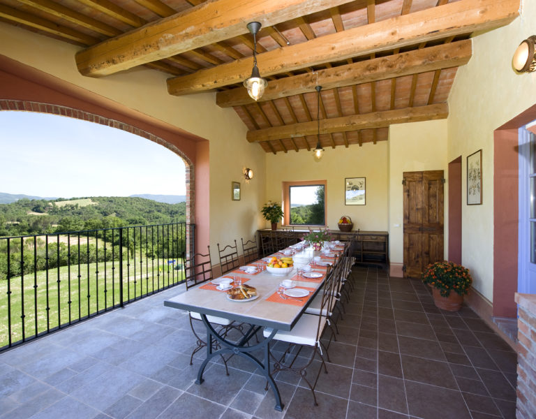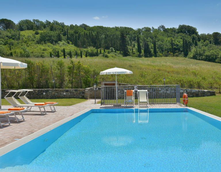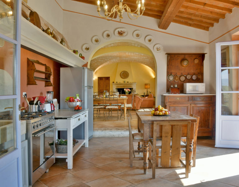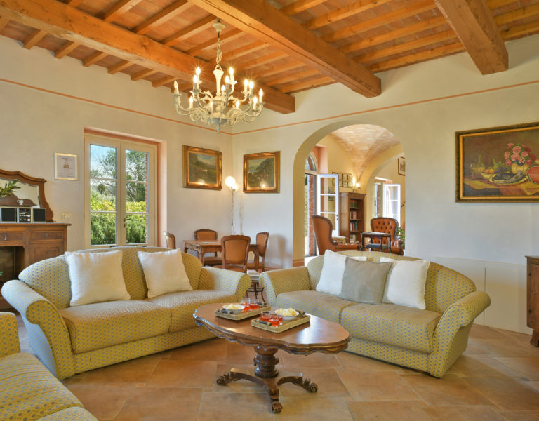 Villa Leccio offers 12 beds and two spacious sitting rooms complete with sofas and coffee tables , a magnificent stone fireplace, and TV lounge complete with SAT – TV  and Wi-fi connection. All the inside furnishings have been created to assure you an elegant atmosphere, but at the same time cosy with every comfort. A spectacular mixture of Tuscan tradition and modern comforts.