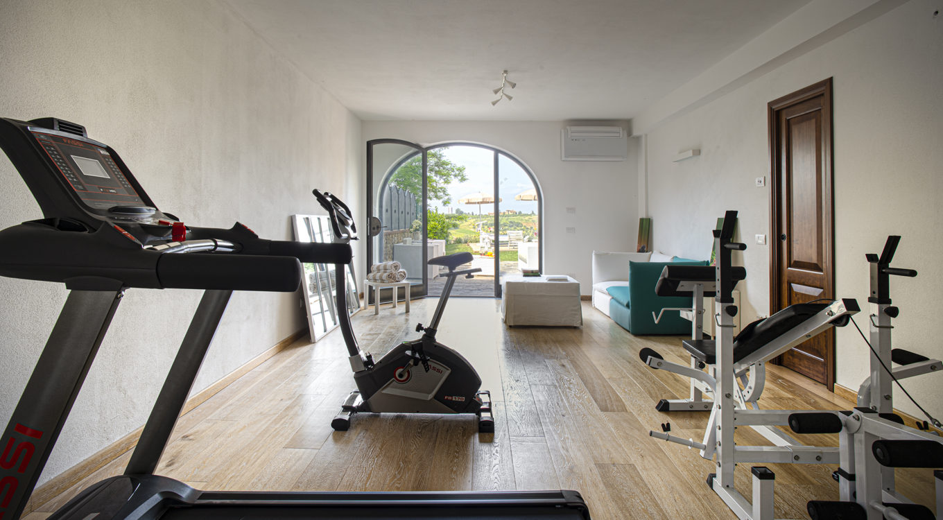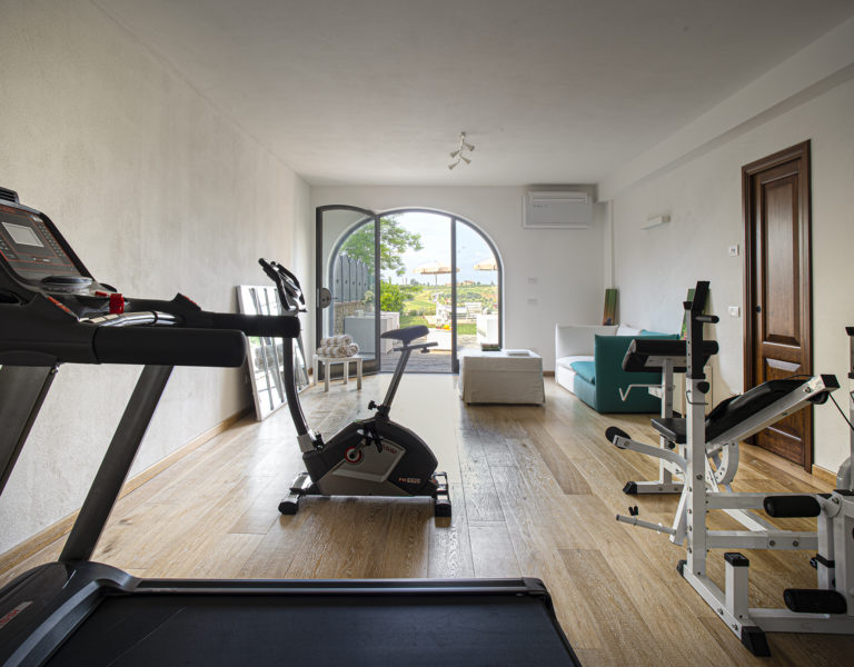 On the Villa lower floor you can find the RELAX room equipped with a treadmill, a stationary bike, a Sofa and bathroom with the shwer.