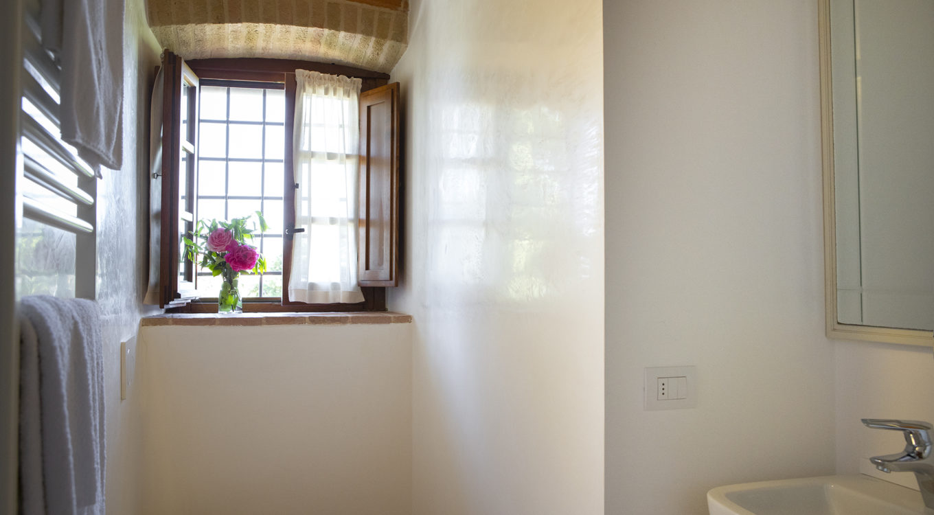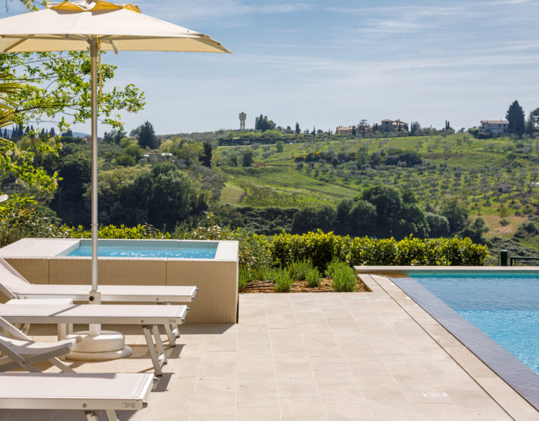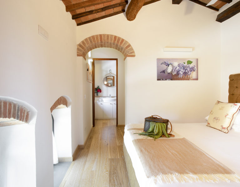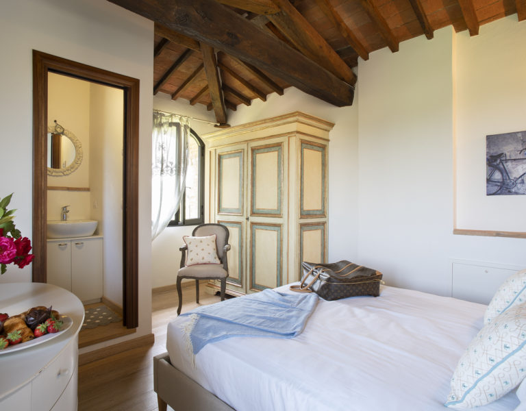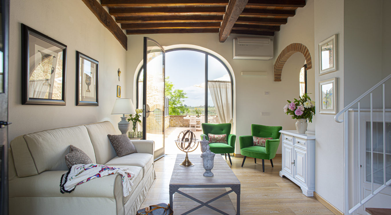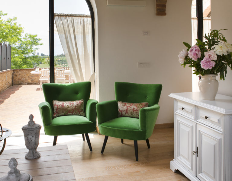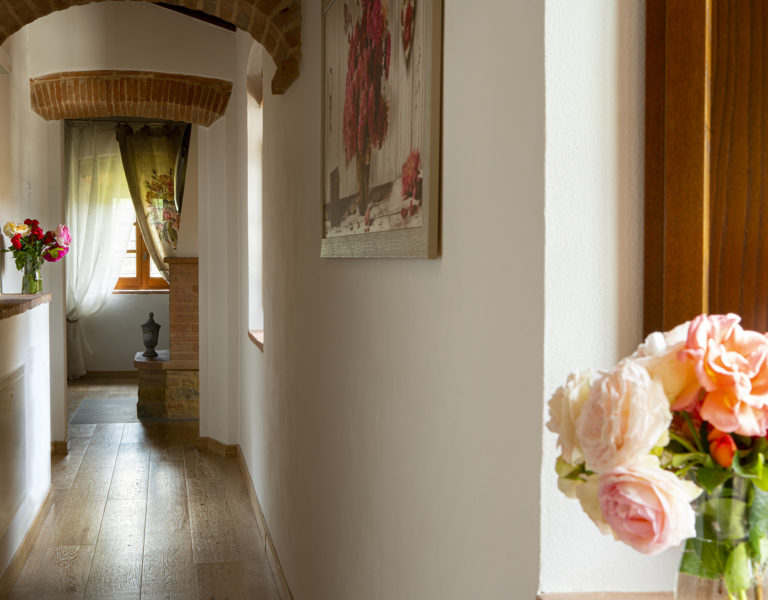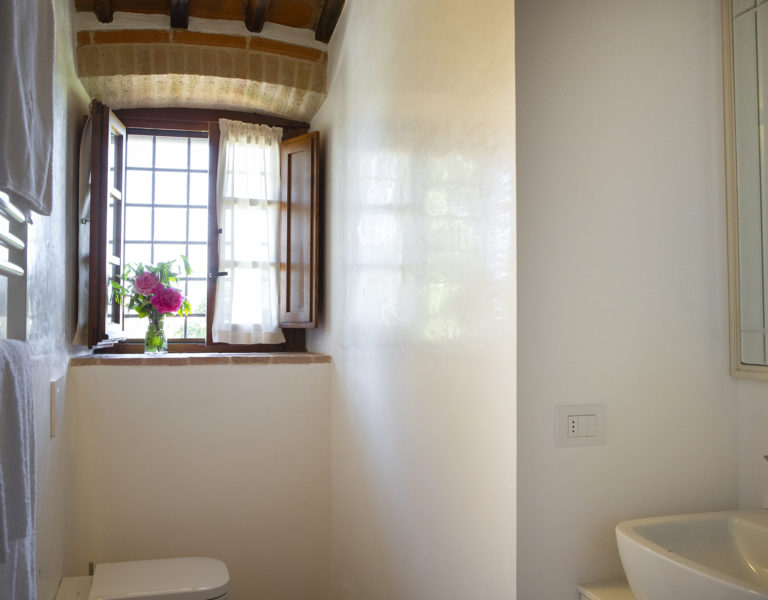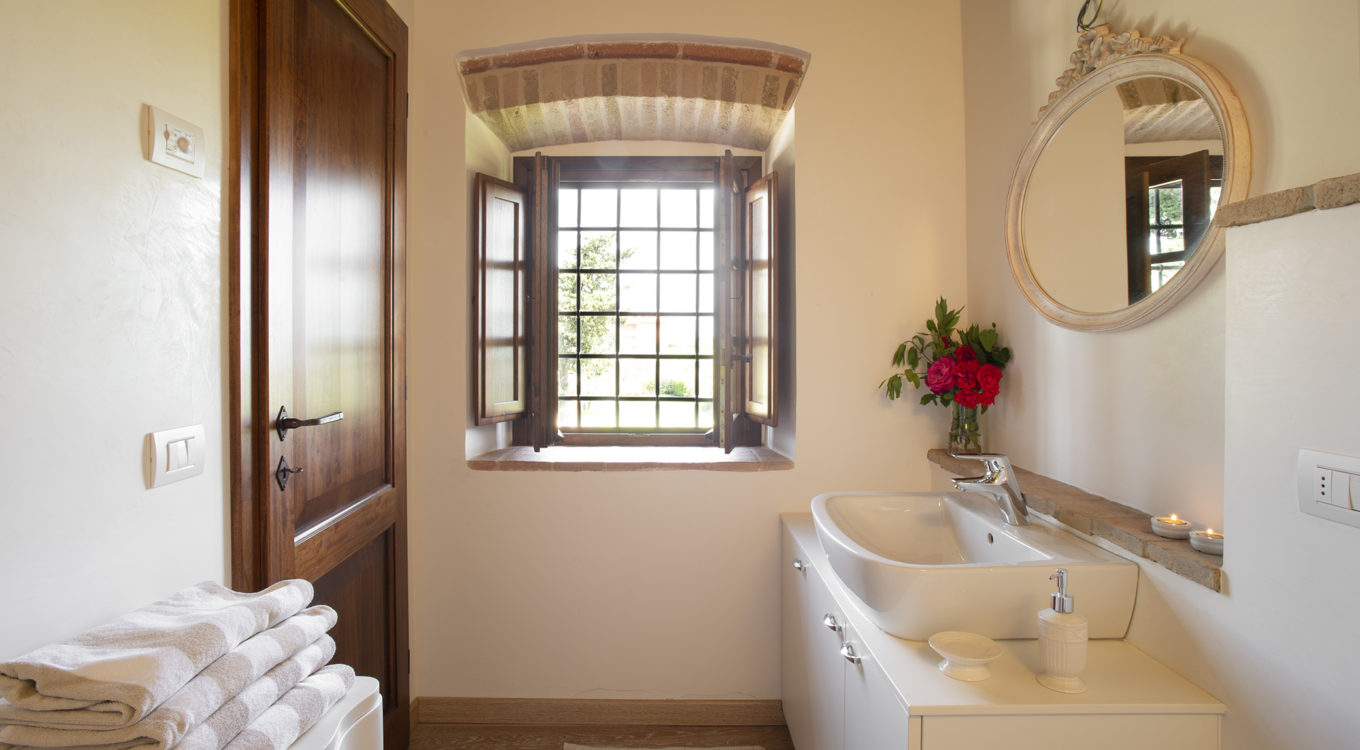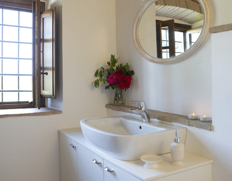 On the Villa first floor are located the three bedrooms Rosa, Girasole and Peonia. Two have double beds and one have two single beds. All the bedrooms have ensuite bathroom with shower. The sixth double bedroom, Gelsomino with bathroom with shower, is located on the Villa’s higher level, on the tower, with a stunning view over the Tuscan countryside, covered with vineyards and olive trees.The Villa is furnished also with lovely living areas with understated elegance which create a welcoming atmosphere. The Villa is completely Air Conditioned.