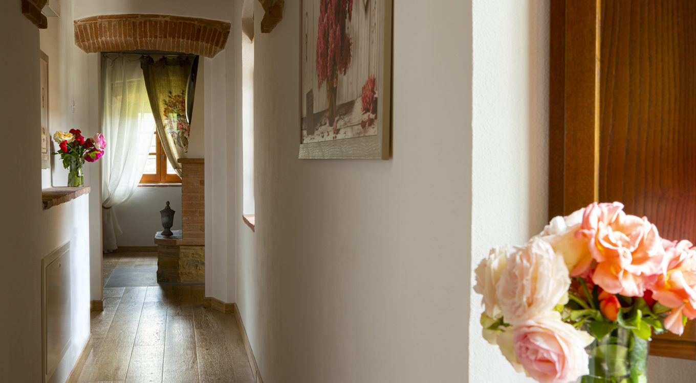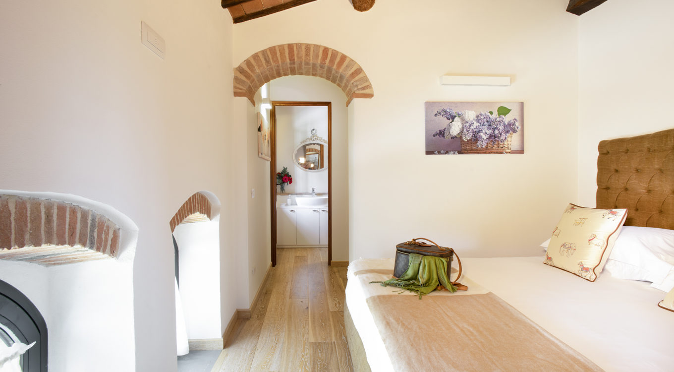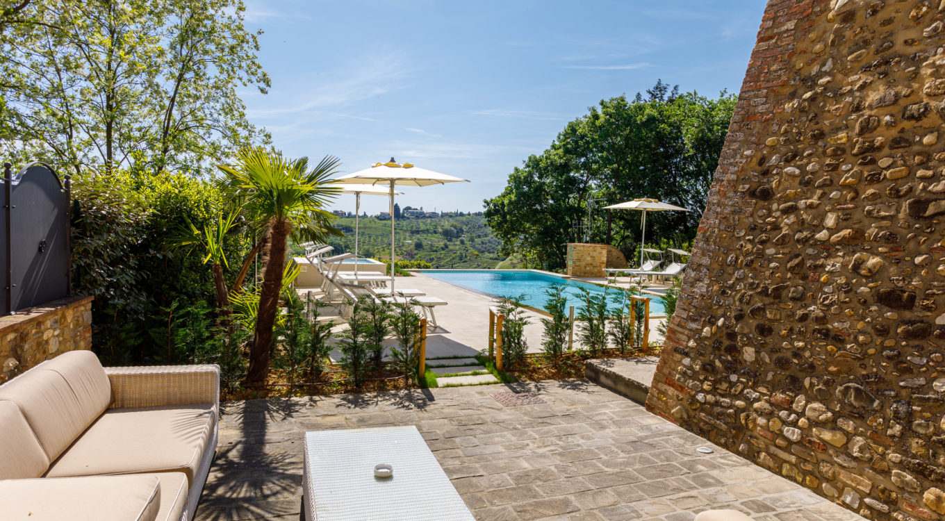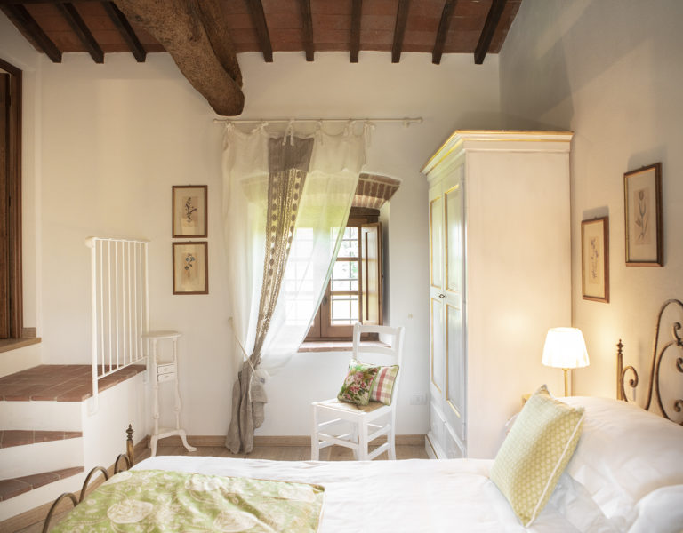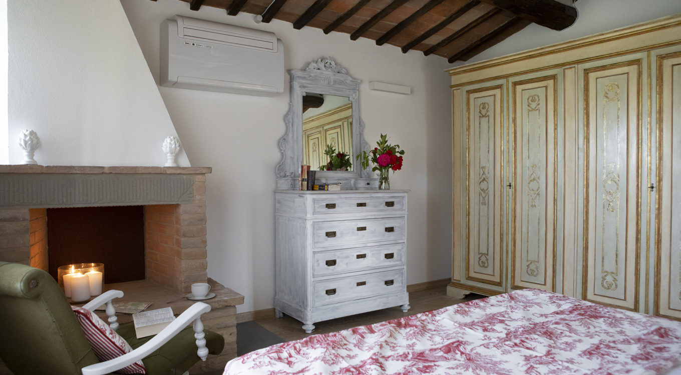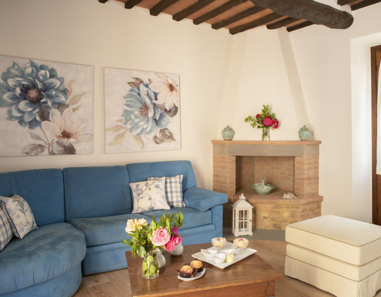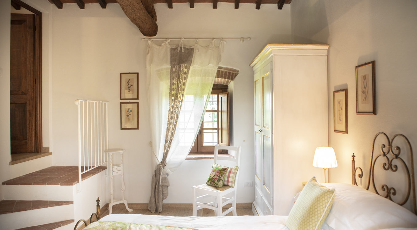 On the Villa first floor are located the three bedrooms Rosa, Girasole and Peonia. Two have double beds and one have two single beds. All the bedrooms have ensuite bathroom with shower. The sixth double bedroom, Gelsomino with bathroom with shower, is located on the Villa’s higher level, on the tower, with a stunning view over the Tuscan countryside, covered with vineyards and olive trees.The Villa is furnished also with lovely living areas with understated elegance which create a welcoming atmosphere. The Villa is completely Air Conditioned.