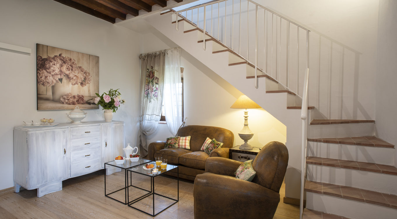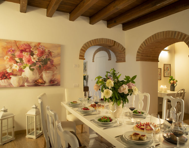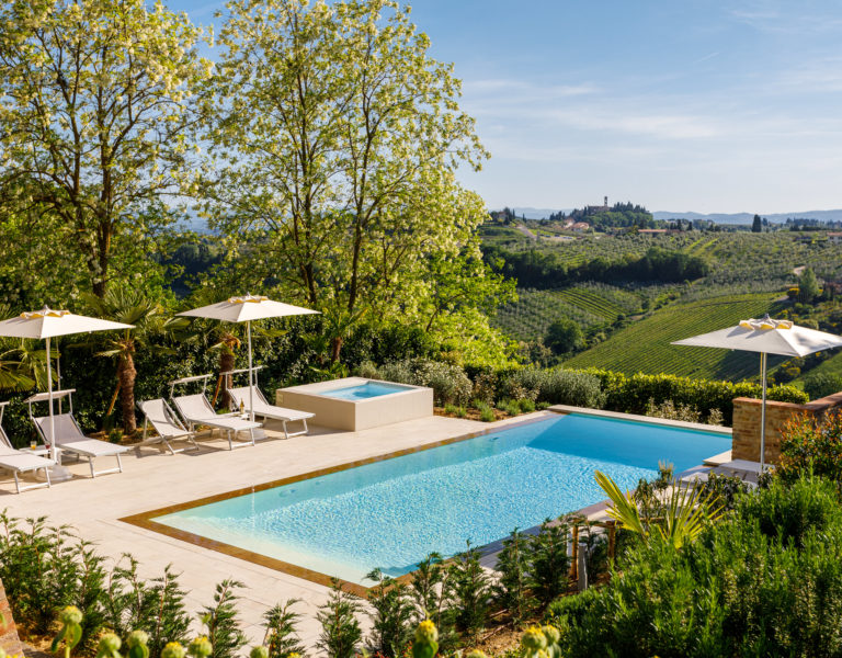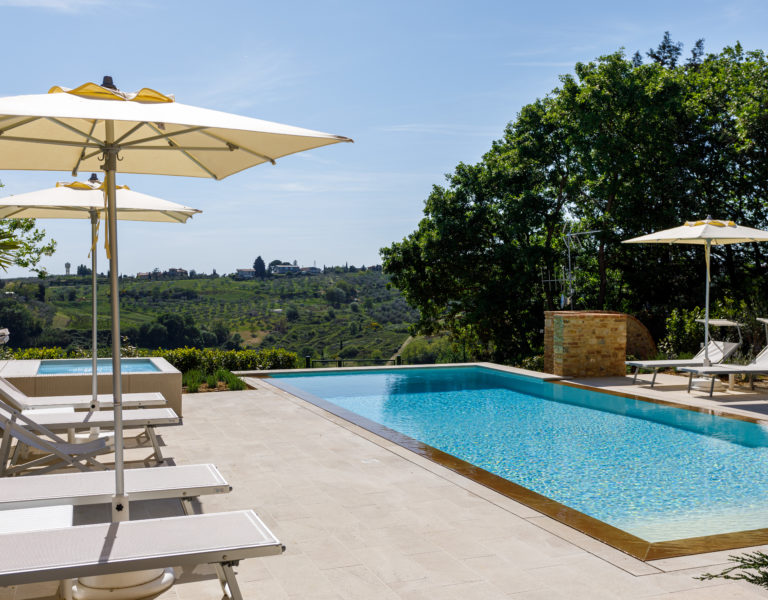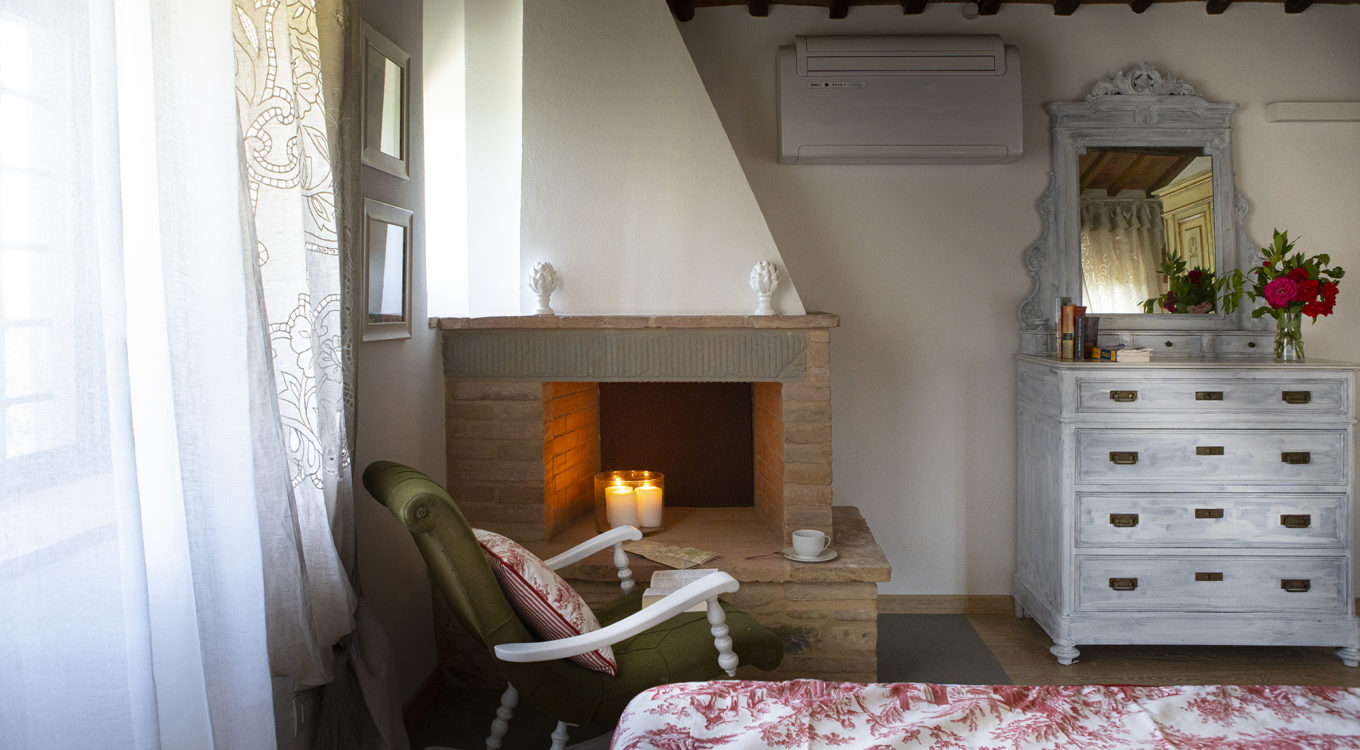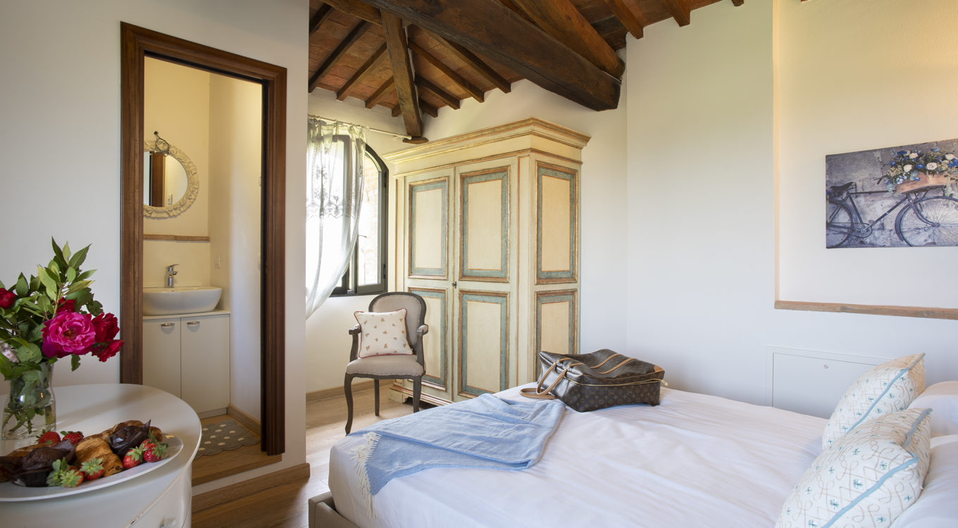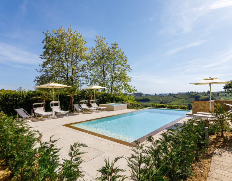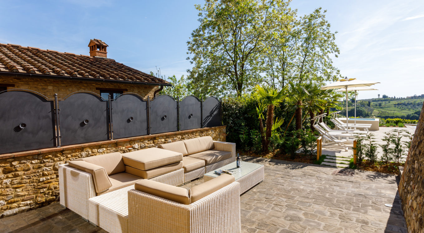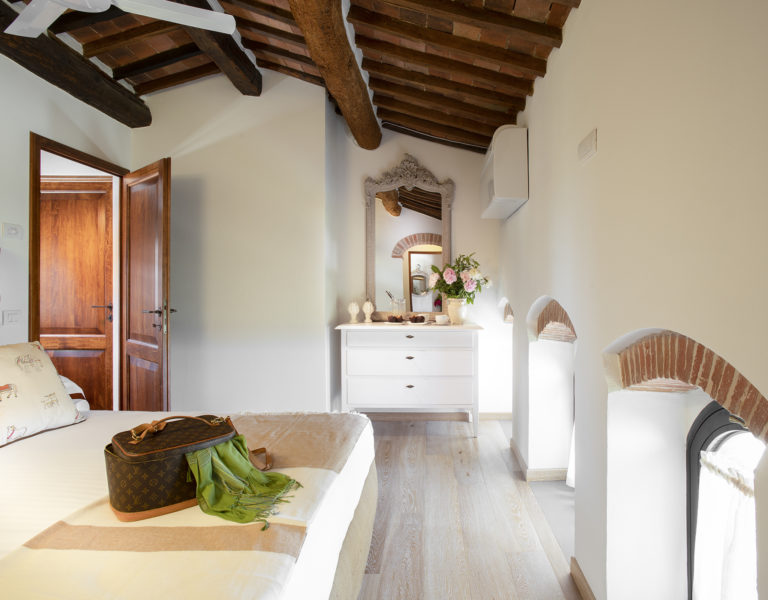 On the Villa first floor are located the three bedrooms Rosa, Girasole and Peonia. Two have double beds and one have two single beds. All the bedrooms have ensuite bathroom with shower. The sixth double bedroom, Gelsomino with bathroom with shower, is located on the Villa’s higher level, on the tower, with a stunning view over the Tuscan countryside, covered with vineyards and olive trees.The Villa is furnished also with lovely living areas with understated elegance which create a welcoming atmosphere. The Villa is completely Air Conditioned.
