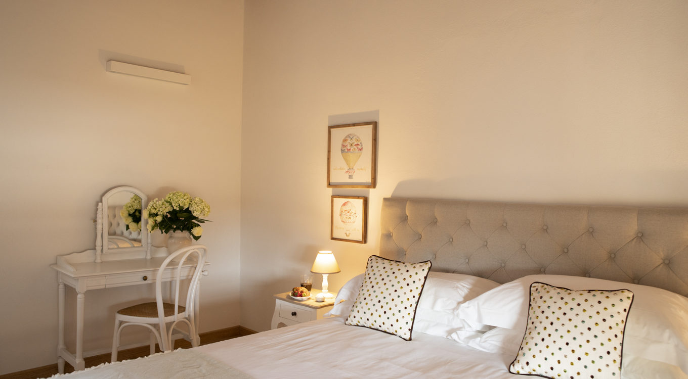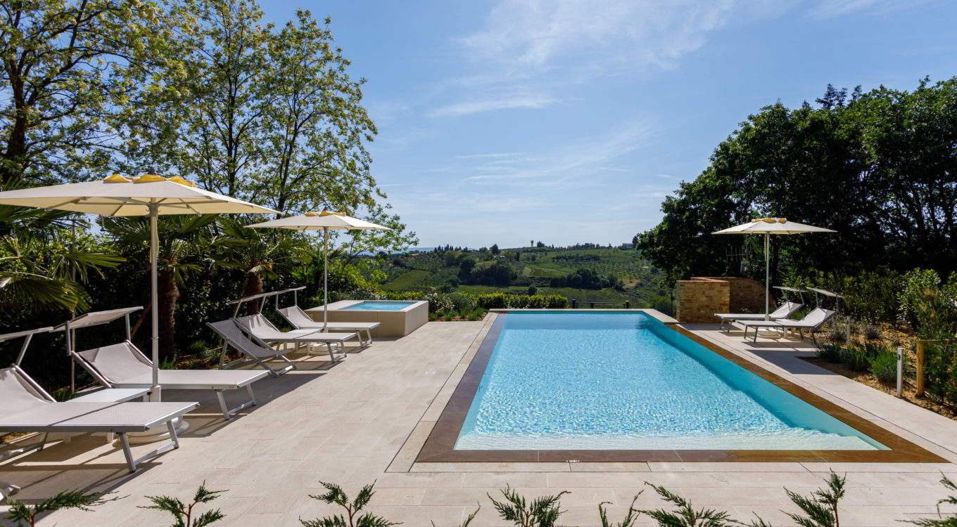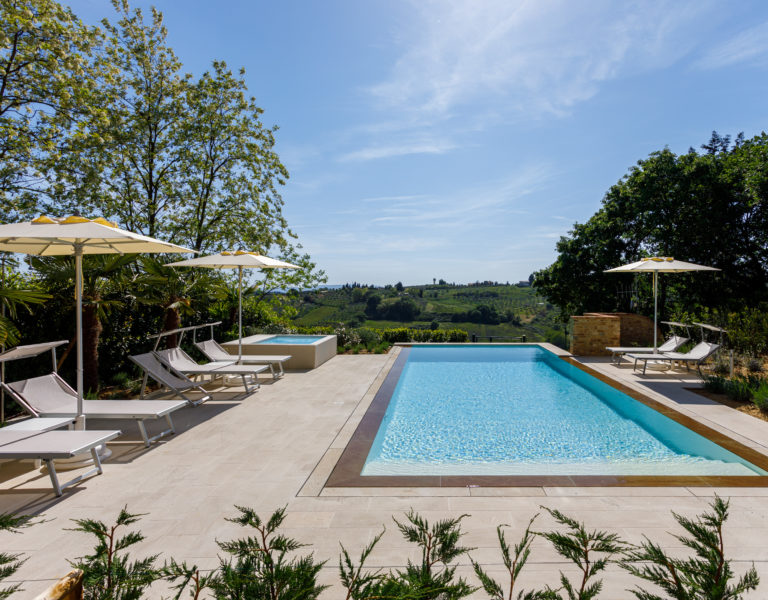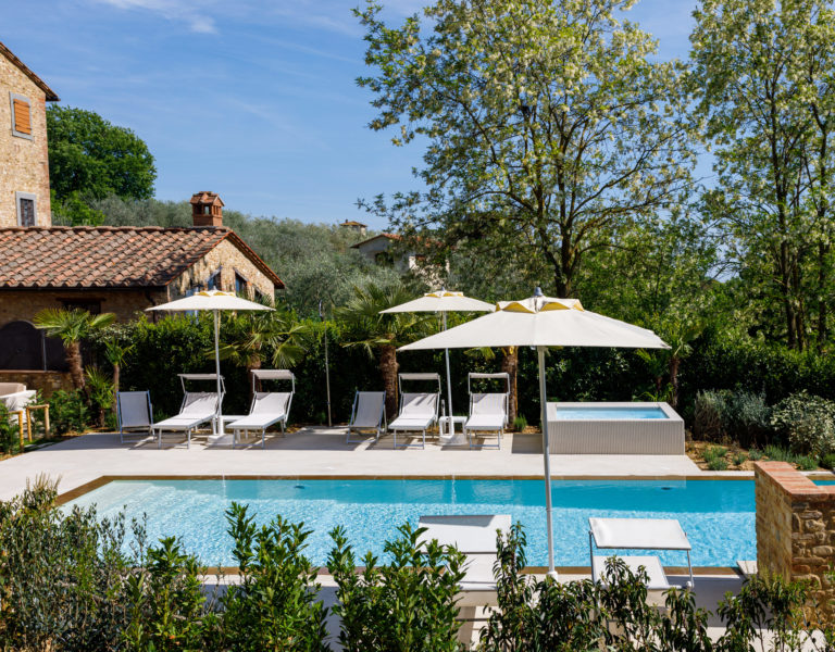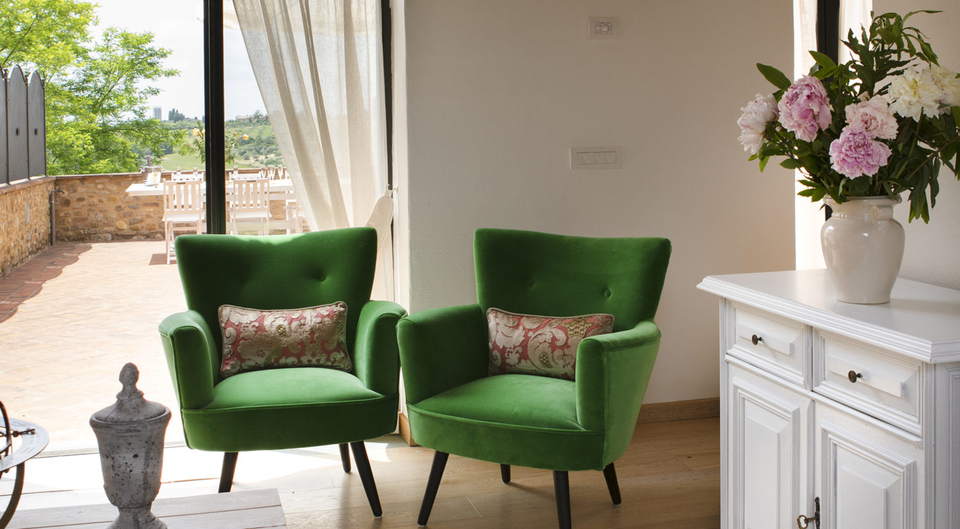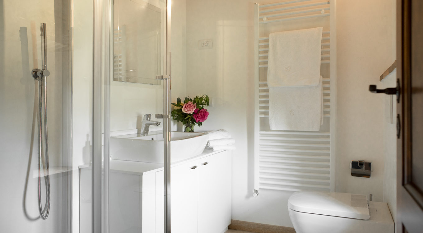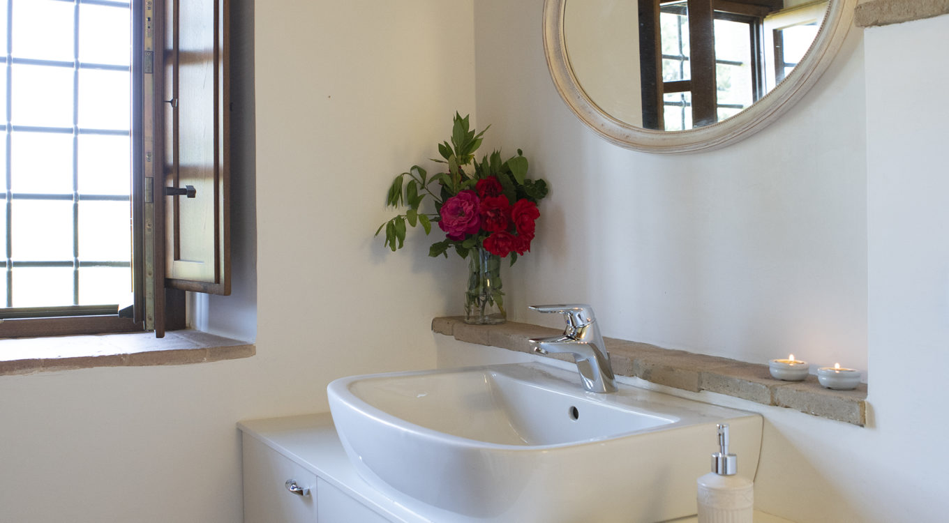 On the Villa first floor are located the three bedrooms Rosa, Girasole and Peonia. Two have double beds and one have two single beds. All the bedrooms have ensuite bathroom with shower. The sixth double bedroom, Gelsomino with bathroom with shower, is located on the Villa’s higher level, on the tower, with a stunning view over the Tuscan countryside, covered with vineyards and olive trees.The Villa is furnished also with lovely living areas with understated elegance which create a welcoming atmosphere. The Villa is completely Air Conditioned.